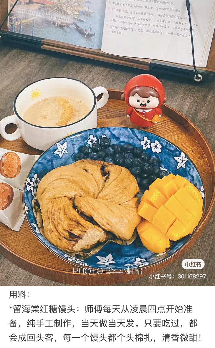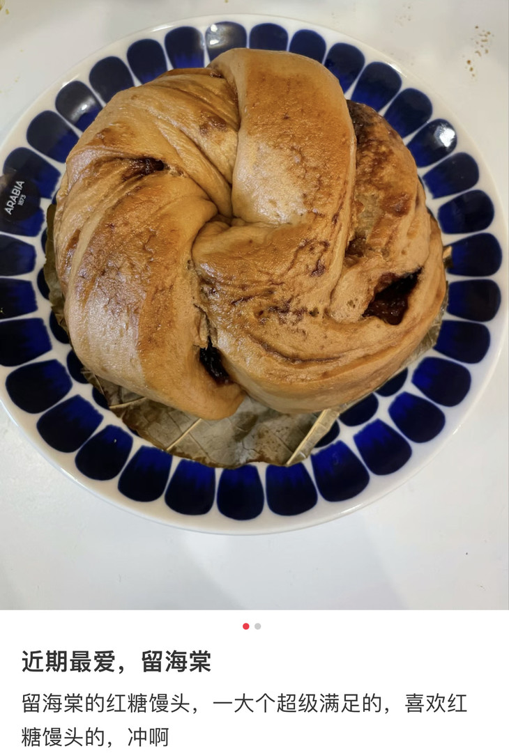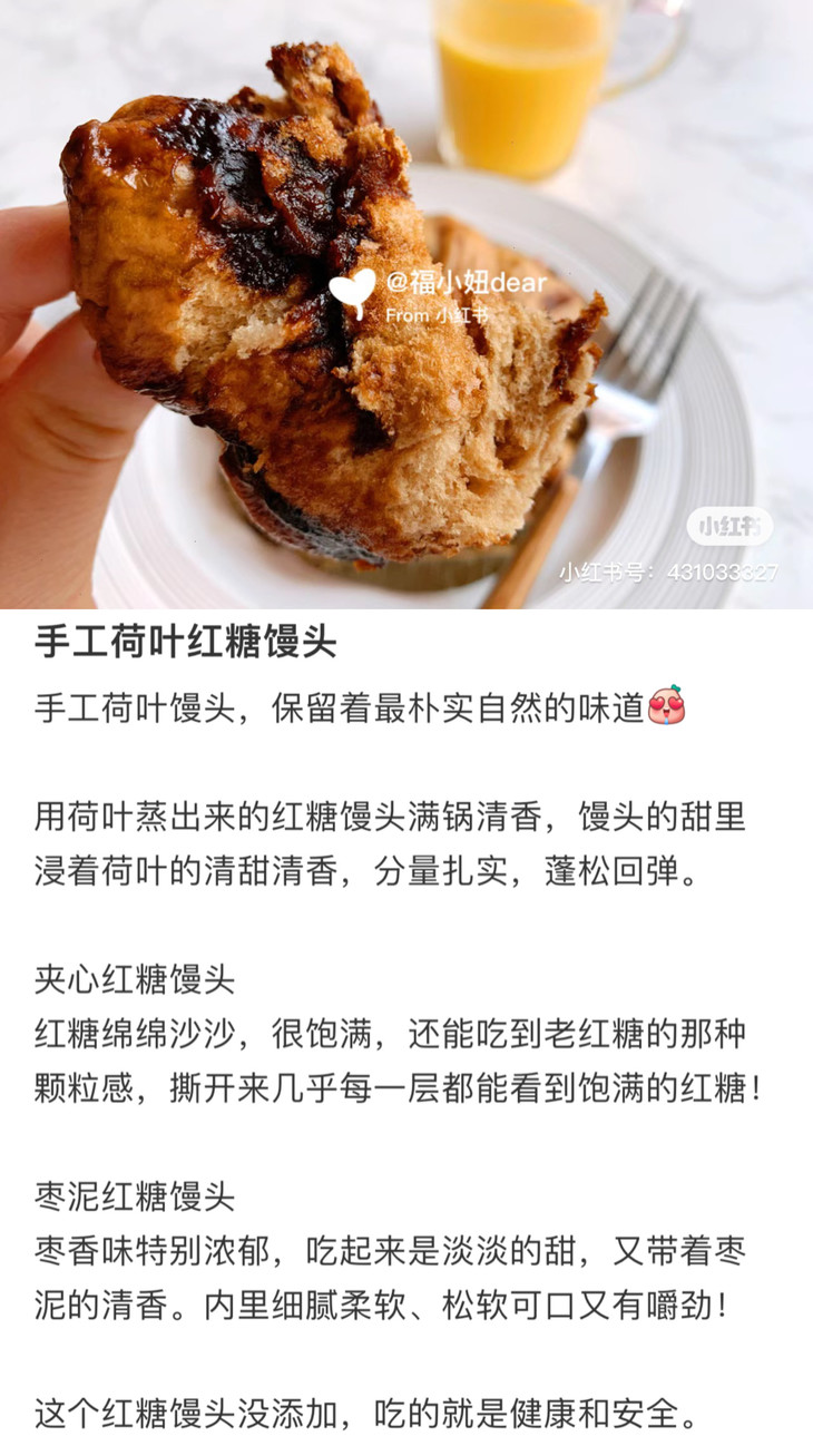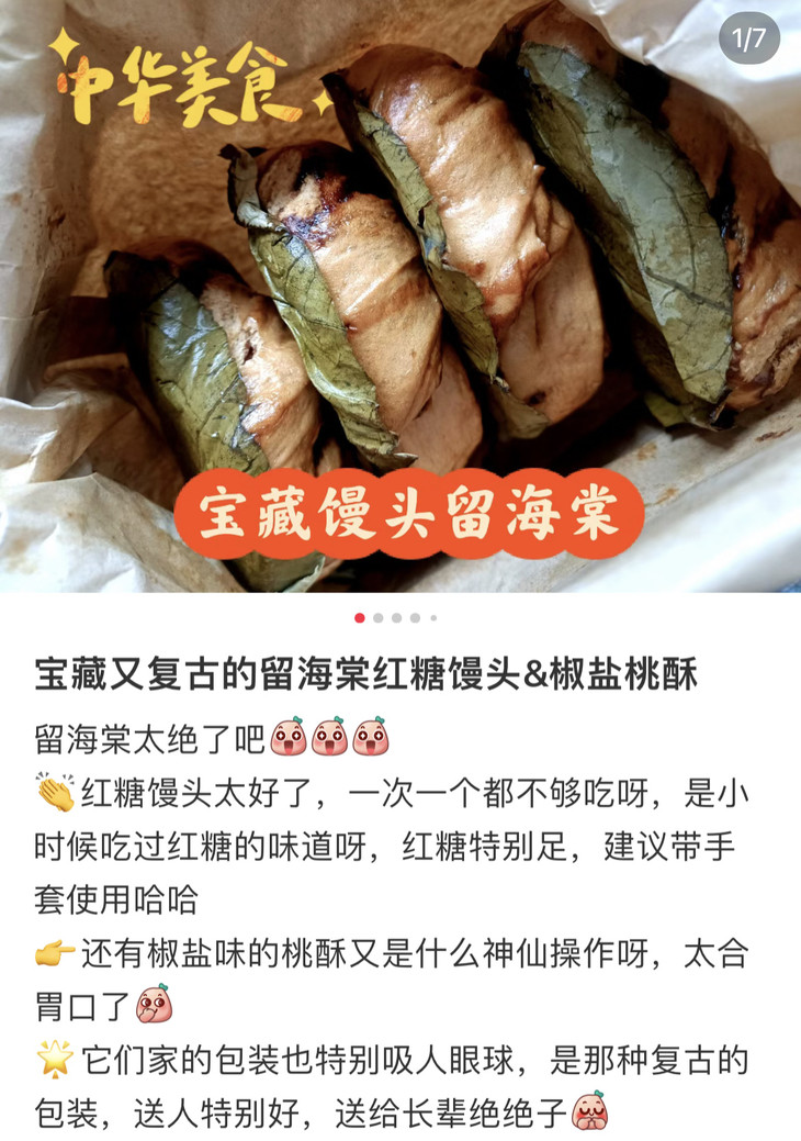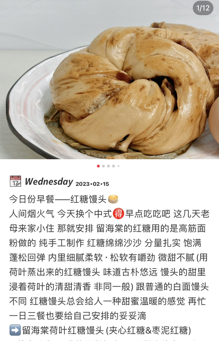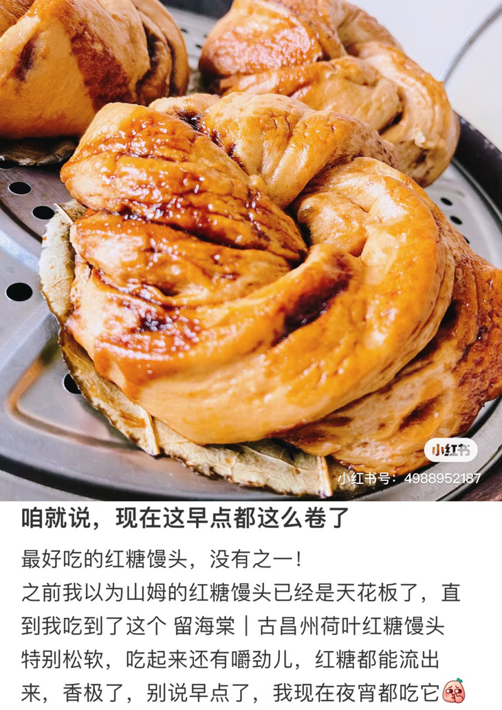 留海棠的荷叶红糖馒头,采用品质高筋面粉,每一个馒头都是纯手工制作,师傅们每天从凌晨四点开始准备,每一个馒头都个头绵扎,足足有二两重,蒸出来的馒头蓬松回弹,口感柔软,现做现发。而且留海棠红糖馒头是零添加,保证健康与美味并存。与普通的白面馒头不同,红糖馒头是用荷叶蒸制,味道古朴悠远,满是荷叶清香。