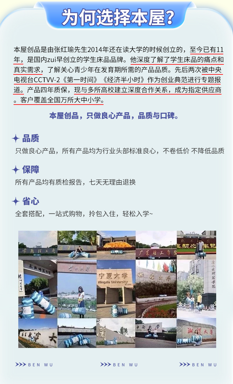 - 成立于2014年,2次被央视专题报道,从为中国大学生提供一套好床品开始,重新定义校园宿舍品质生活。以"纯棉舒适、安全环保、现代简约"为设计原点,还构建校园成长生态,为大学生提供实习机会。