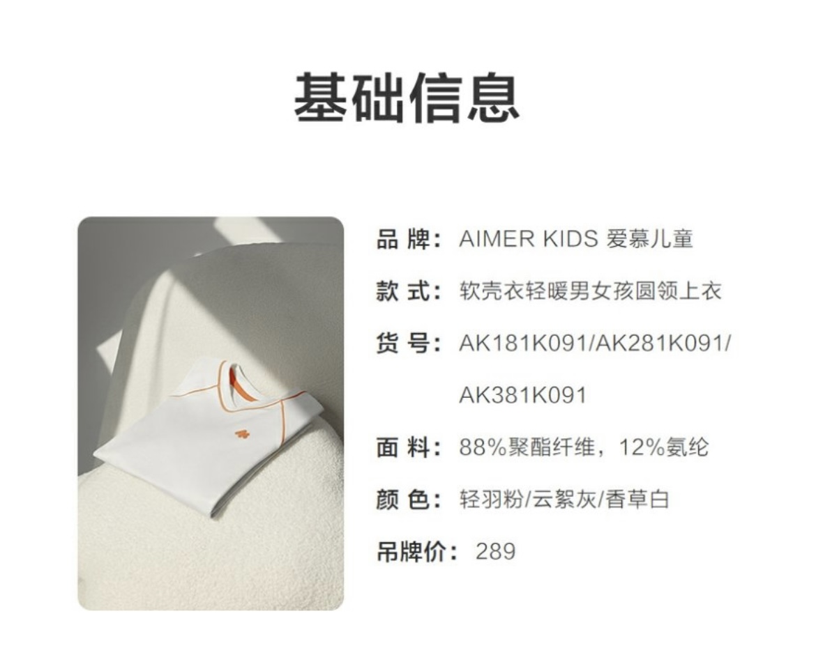 【春上新】8楼爱慕儿童Aimer Kids男孩软壳衣轻暖圆领上衣AK281K091,吊牌价289元