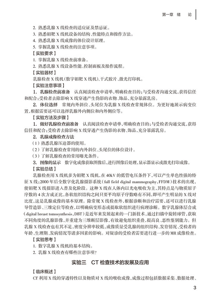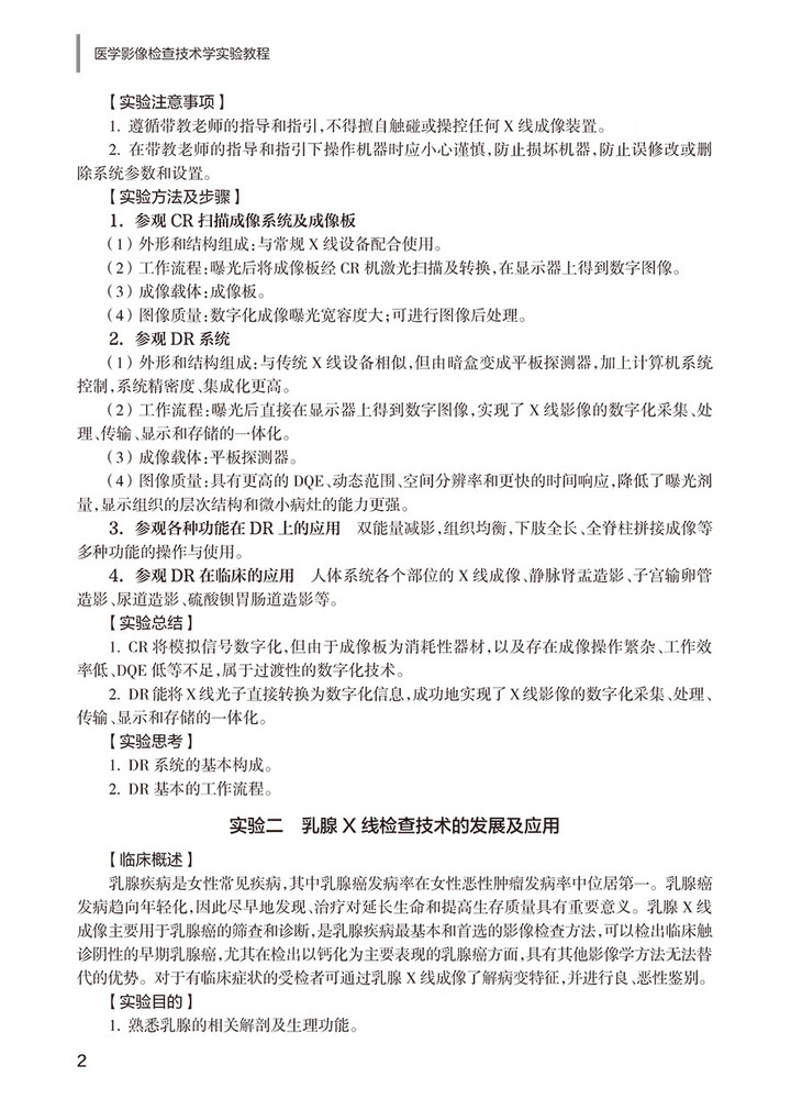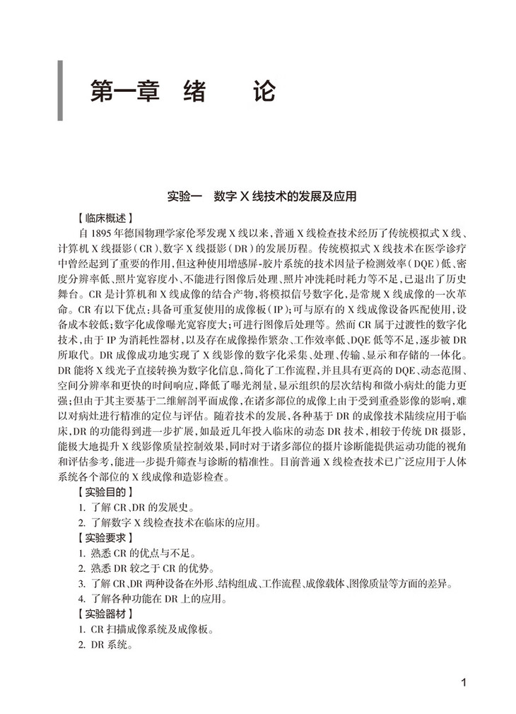 本教材为《医学影像检查技术学》配套实验教程,全书有15章,第一章绪论有7个实验;第二章 数字X线检查技术实验有25个实验;第三章头颈部CT检查技术实验有:颅脑CT检查技术、鞍区CT检查技术、眼部CT检查技术、耳部CT检查技术、鼻骨与鼻窦CT检查技术、口腔颌面部CT检查技术、咽喉部CT检查技术、颈部CT检查技术;第四章胸部CT检查技术有11个实验;第五章腹部与盆腔CT检查技术有8个实验;第六章脊柱及四肢骨关节与血管CT检查技术有6个实验;第七章CT图像质量控制有1个实验;第八章 DSA检查技术有10个实验;第九章 DSA图像质量控制有1个实验;第十章颅脑、颈部与五官磁共振检查技术有13个实验;第十一章 胸部磁共振检查技术有8个实验;第十二章腹部、盆腔磁共振检查技术有11个实验;第十三章 四肢骨关节、脊柱脊髓与外周神经血管MRI检查技术有17个实验;第十四章 MR图像质量控制有5个实验;第十五章 核医学影像检查技术有13个实验.每一实验包括临床概述、实验目的、实验要求、实验器材、实验注意事项、实验方法及步骤、实验总结和实验思考。