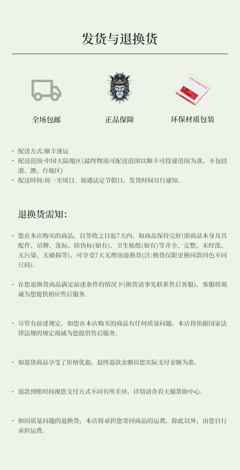 | 售后标准 | 不影响二次销售的情况下支持7天无理由退换!非质量问题退换货买家承担! |