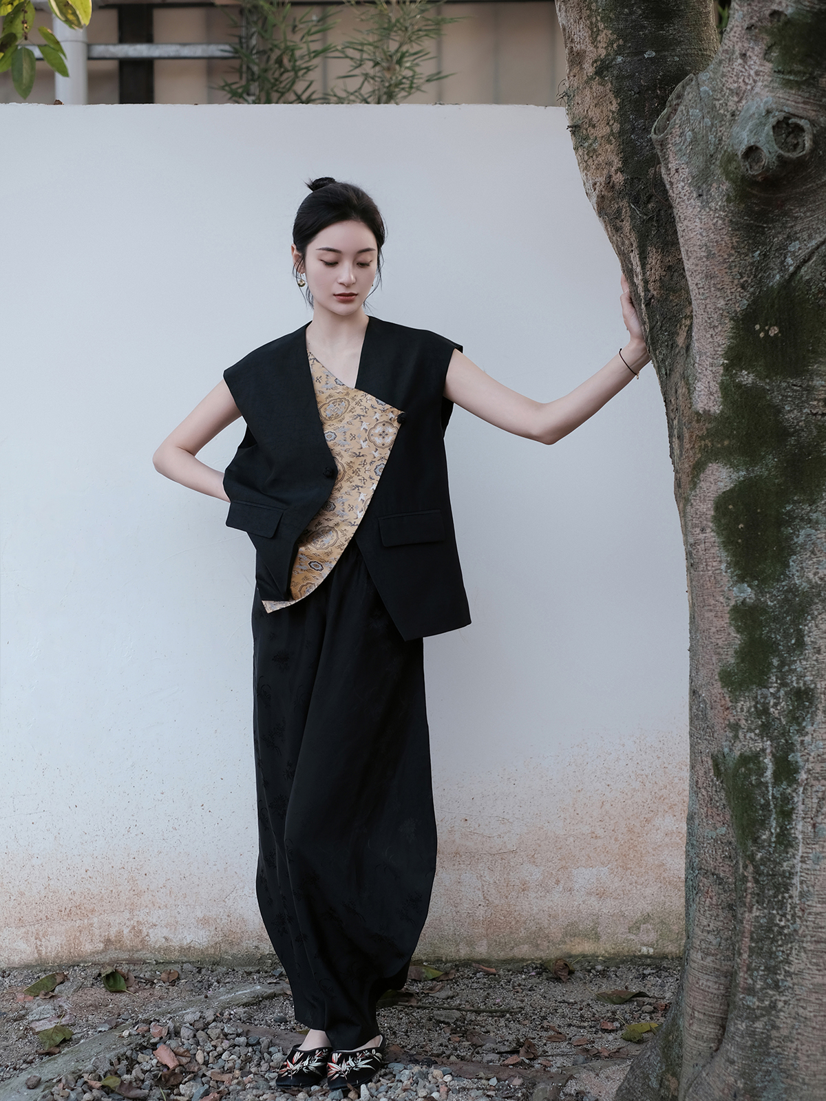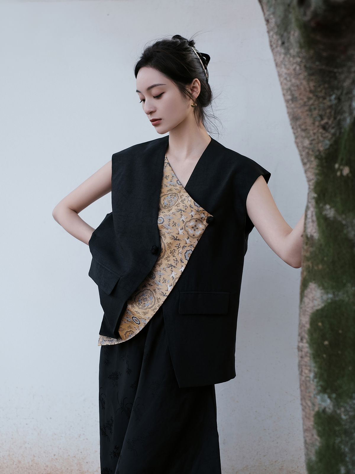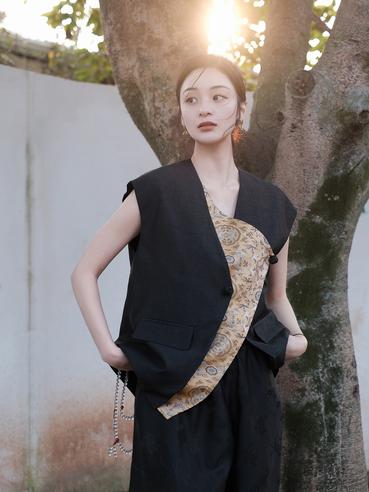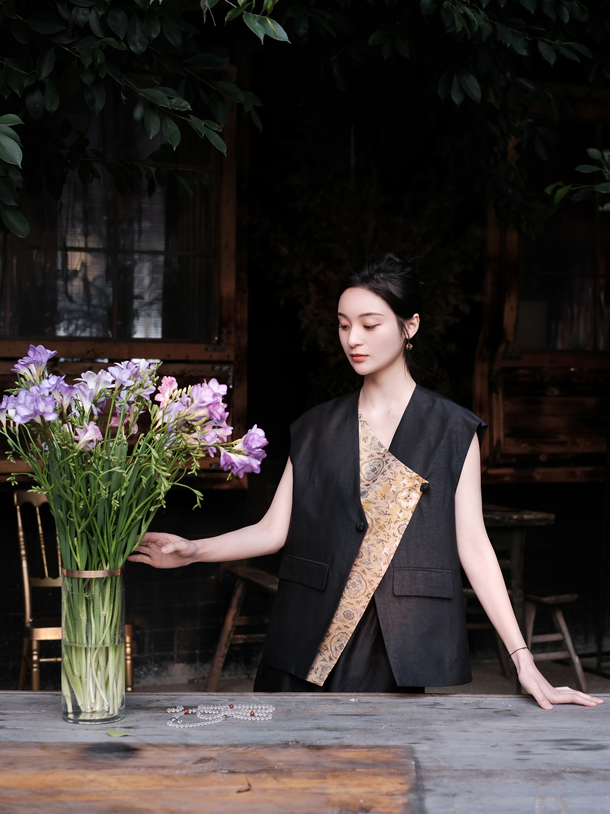 盛唐牡丹 |龟纹香云纱拼宋锦马甲
