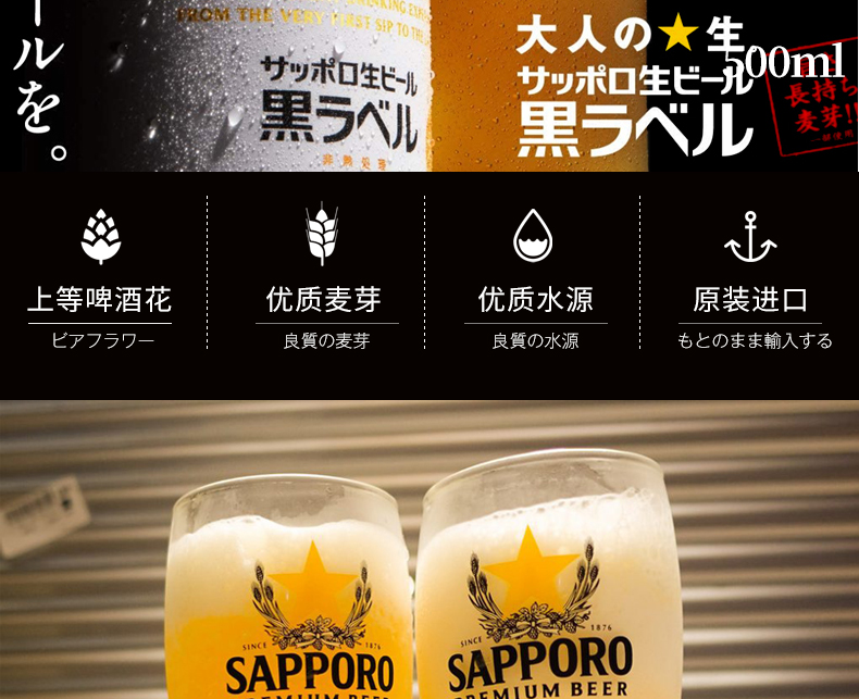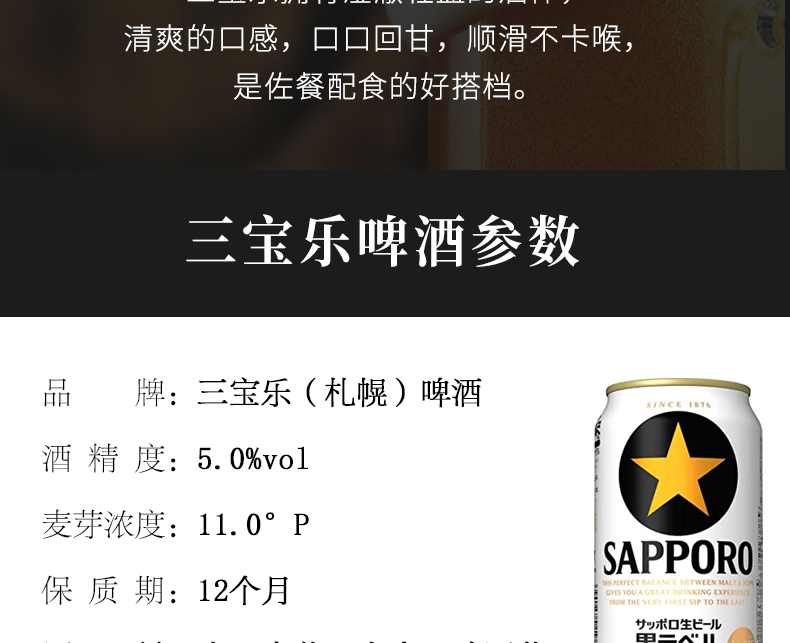 三宝乐SAPPORO日本原装进口札幌经典黑星标鲜生啤酒 350ml