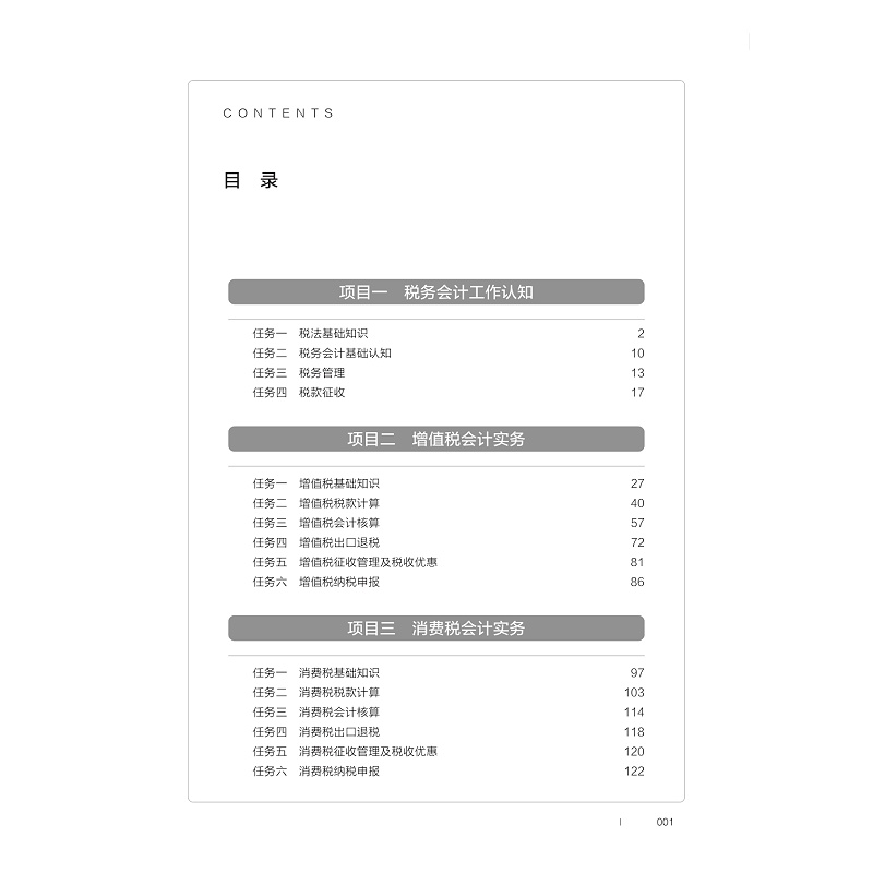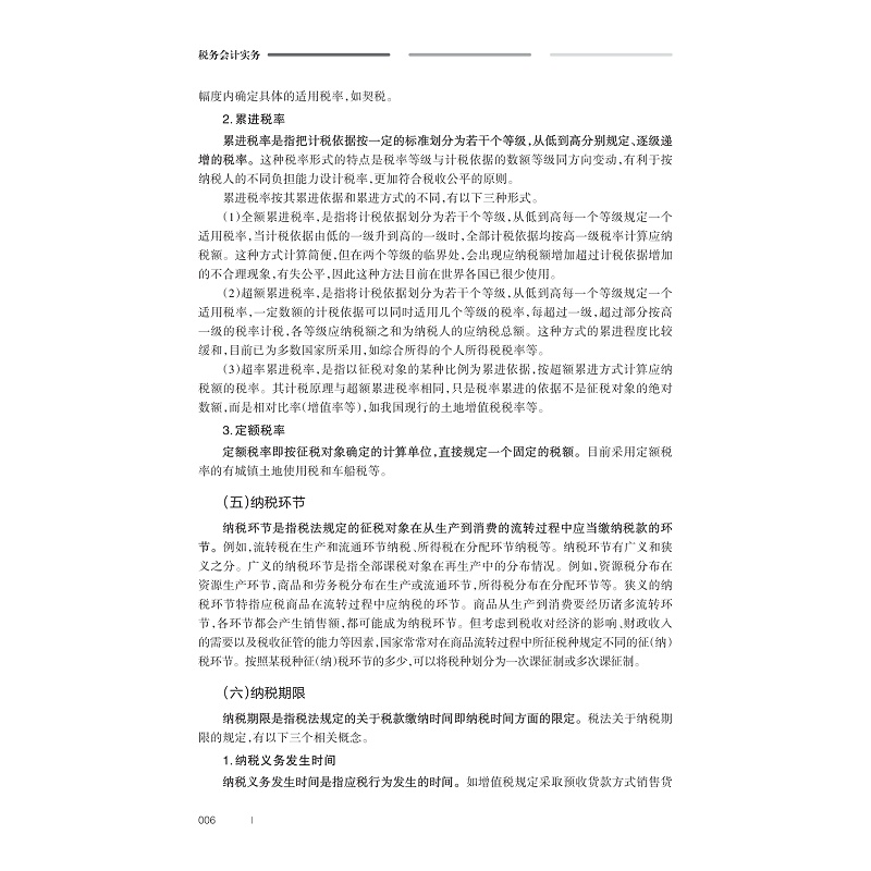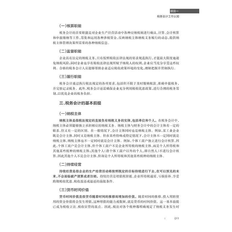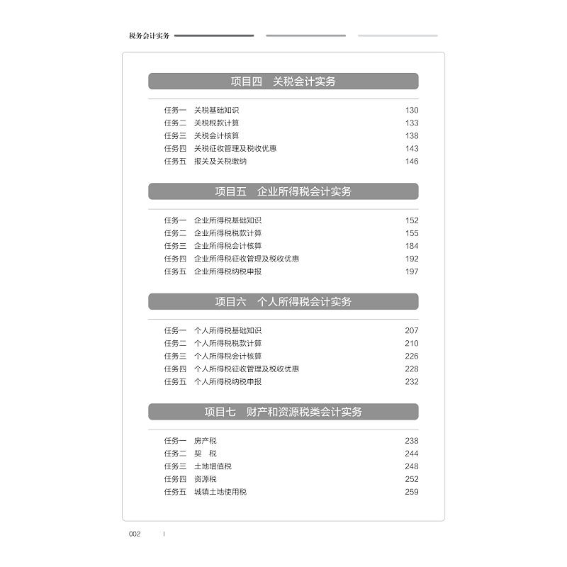 《税务会计实务》是高等职业院校大数据与会计专业的一门专业核心课程, 教材在编写初期与产教融合基地企业——杭州耘穗财务咨询有限公司、杭州贝丰科技有限公司深度沟通,以能力本位教育思想为理论基础,依据税务会计工作岗位的实际工作过程,确定典型任务,对标1+X 证书内容及相关竞赛能力要素,明确知识技能要点,将“产业案例+专业知识+创新创业理念+德育元素”充分融入其中,由浅入深,由易及难,由理论到实践,精心设计每个环节。充分体现“产教德创”编写理念、“岗课赛证”融通模式及“线上线下”混合策略,不断深化教材改革。基于最新会计准则、税务政策,以学生为中心,引入真实工作案例进行编写,共包括 8个项目,即税务会计工作认知、增值税会计实务、消费税会计实务、关税会计实务、企业所得税会计实务、个人所得税会计实务、其他税种会计实务、纳税筹划基本思路。旨在培养学生税费计算、纳税申报、会计核算、简单风险评估、税收筹划等职业技能及精益求精、遵纪守法的职业素养。通过线上线下混合式教学实现融“知识传授、能力培养、素质教育”于一体的“德技兼修”综合目标。