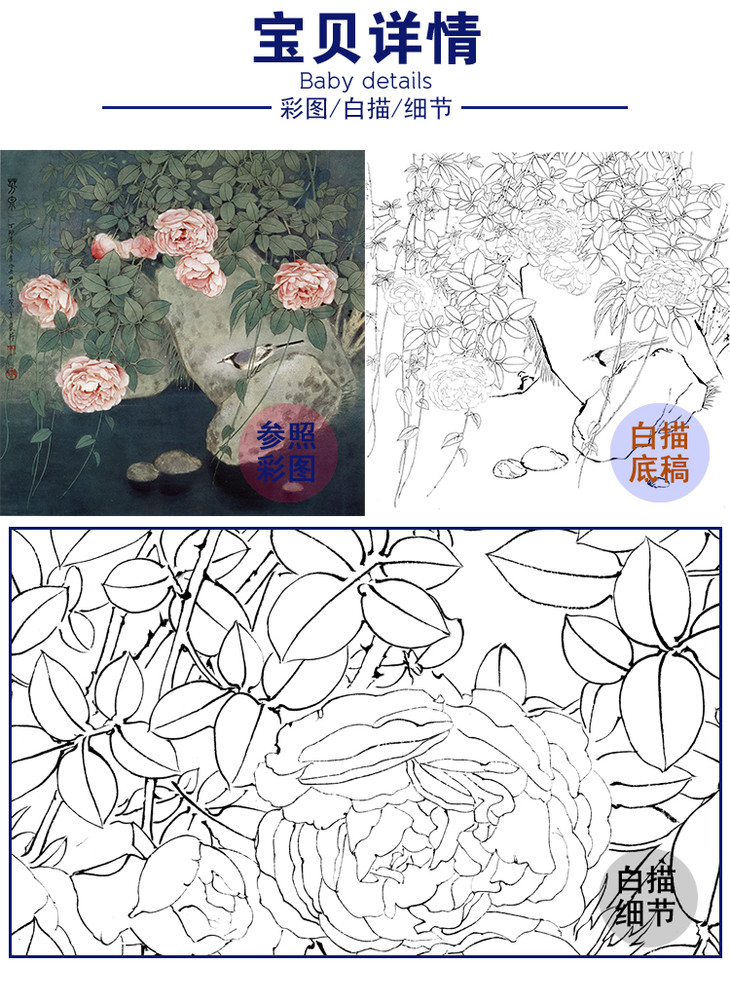 工笔花鸟白描底稿--玫瑰-王庆升《芳泉》斗方小品册页-多种白描尺寸可选-QB04