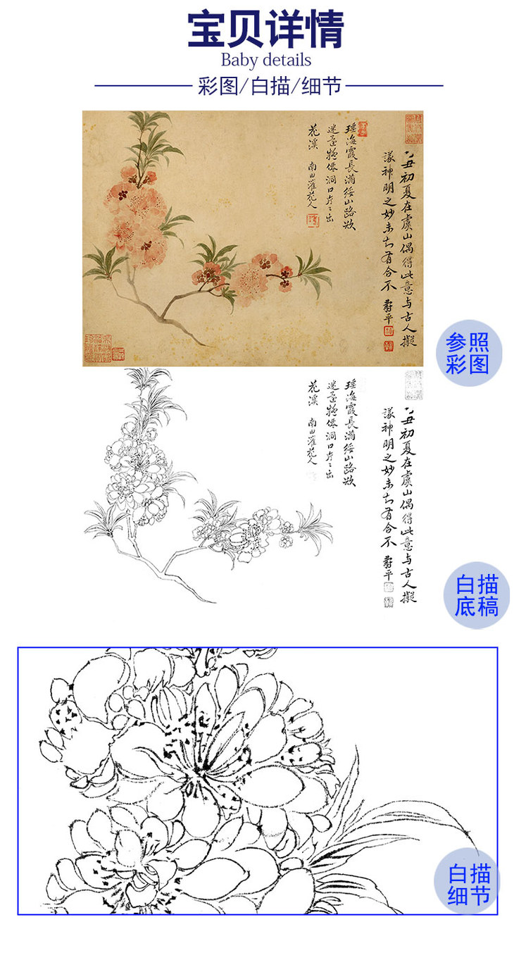 【有步骤、大彩图】李晓明竖幅工笔花鸟画白描底稿《牡丹鹦鹉图》多种白描尺寸可选KG16