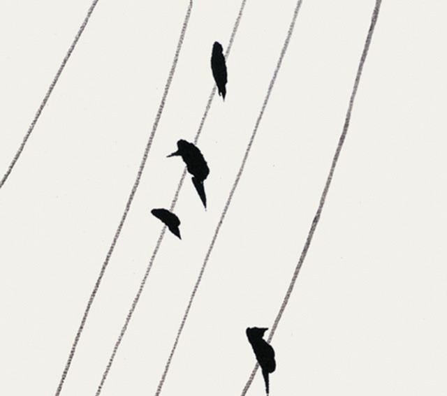常有三五成群的燕子栖憩在电线上,如见五线谱,非田园交响乐,是形式交响乐。当燕子不飞的时候,停息在高空电线上,静如处子,构成了空中五线谱之曲调,此时无声胜有声。