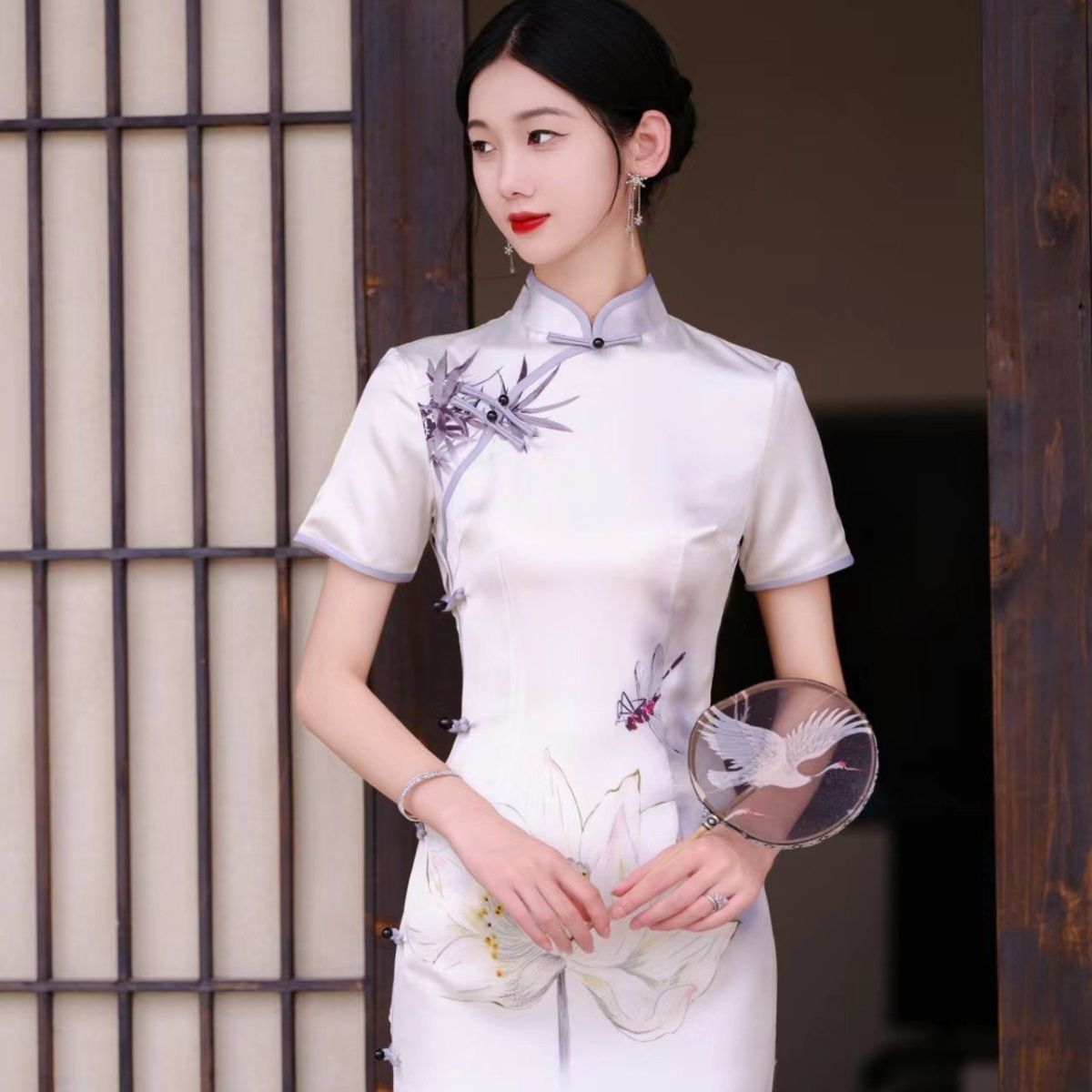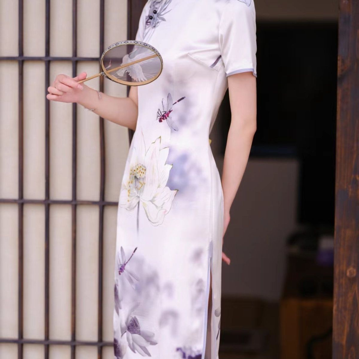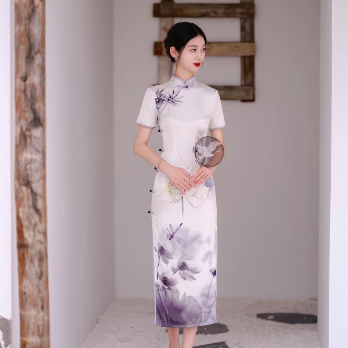 YSZ2023长款优雅显瘦高端大气复古水墨荷花走秀日常军阀太太旗袍