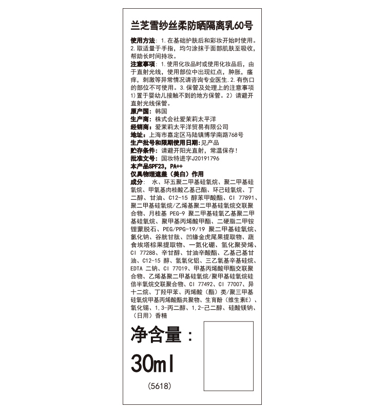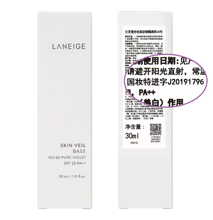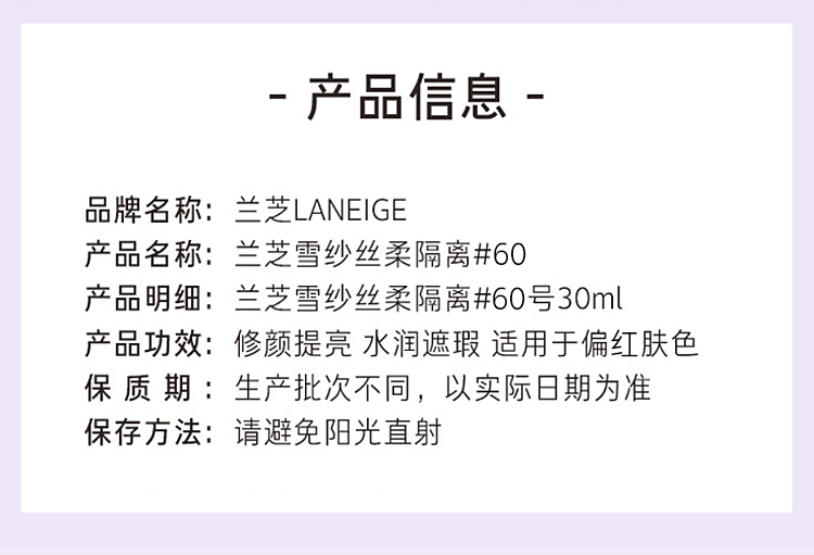韩国兰芝隔离霜雪纱丝柔防晒紫隔离乳30ml