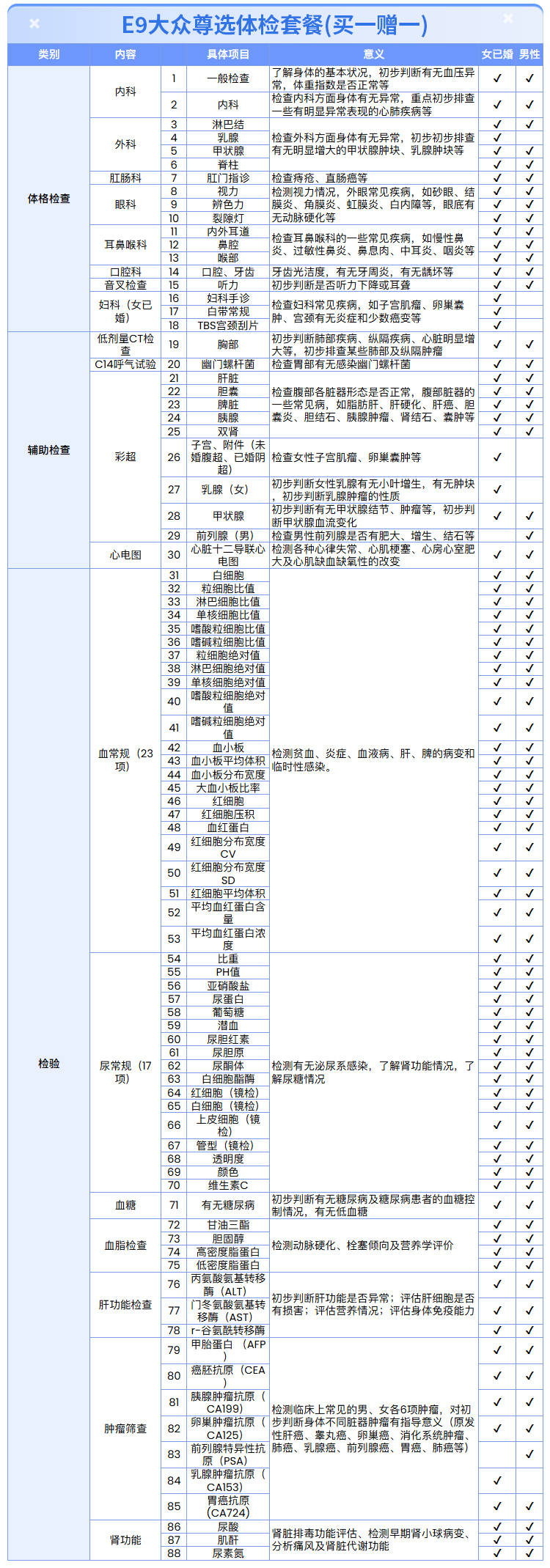 【双人体检|标准家庭通用】含胸部CT+七彩超+C14+肝肾功能+肿瘤六项 E9
