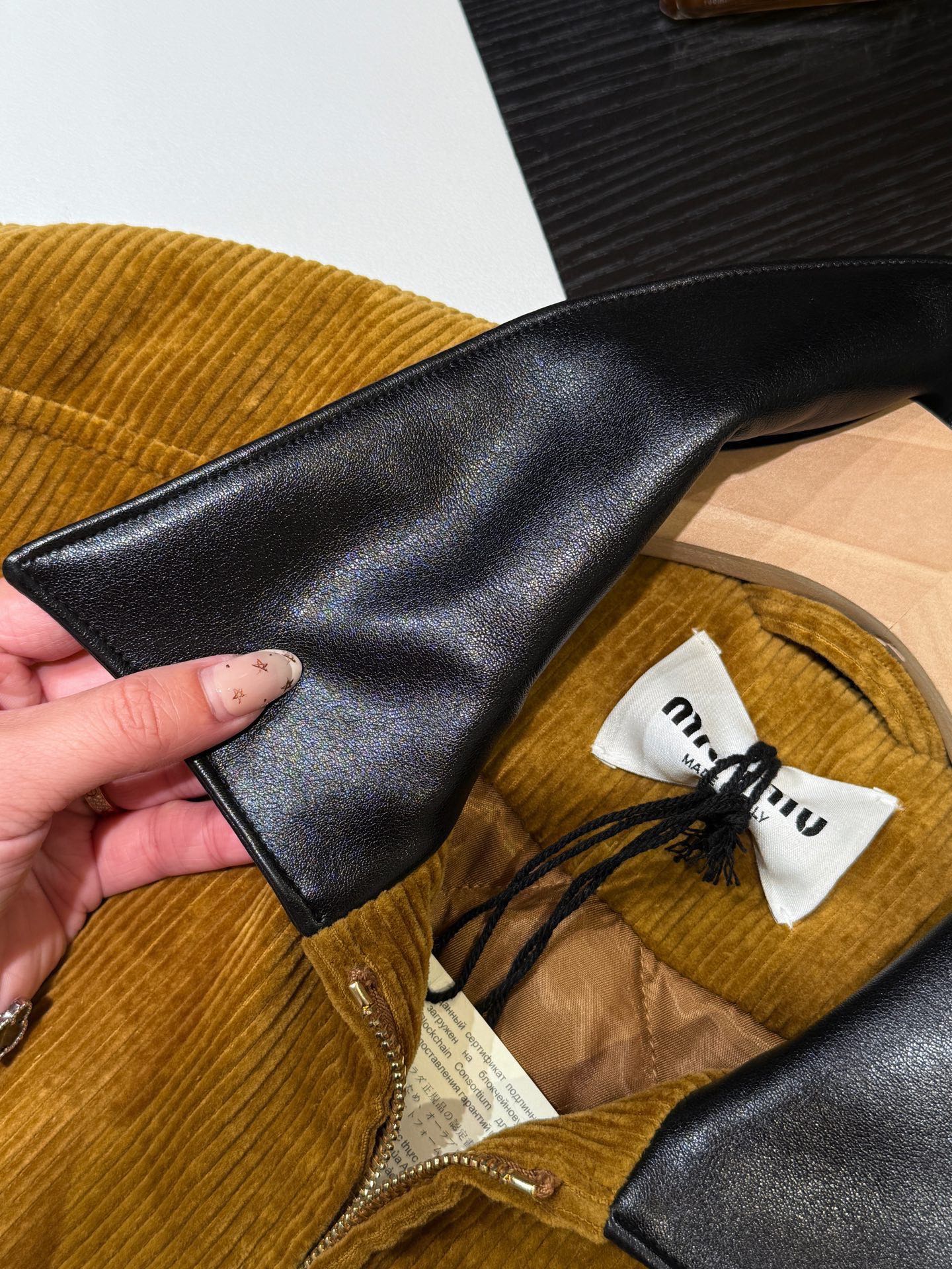 最新款领口都是黑色配皮,同步原版定制𝐏𝐔材质 经匠人多道鞣制、打磨与养护工序 清晰的皮质纹理感 呈现出迷人视觉层次 沉淀出复古韵味 ,立体设计舒适度更高!