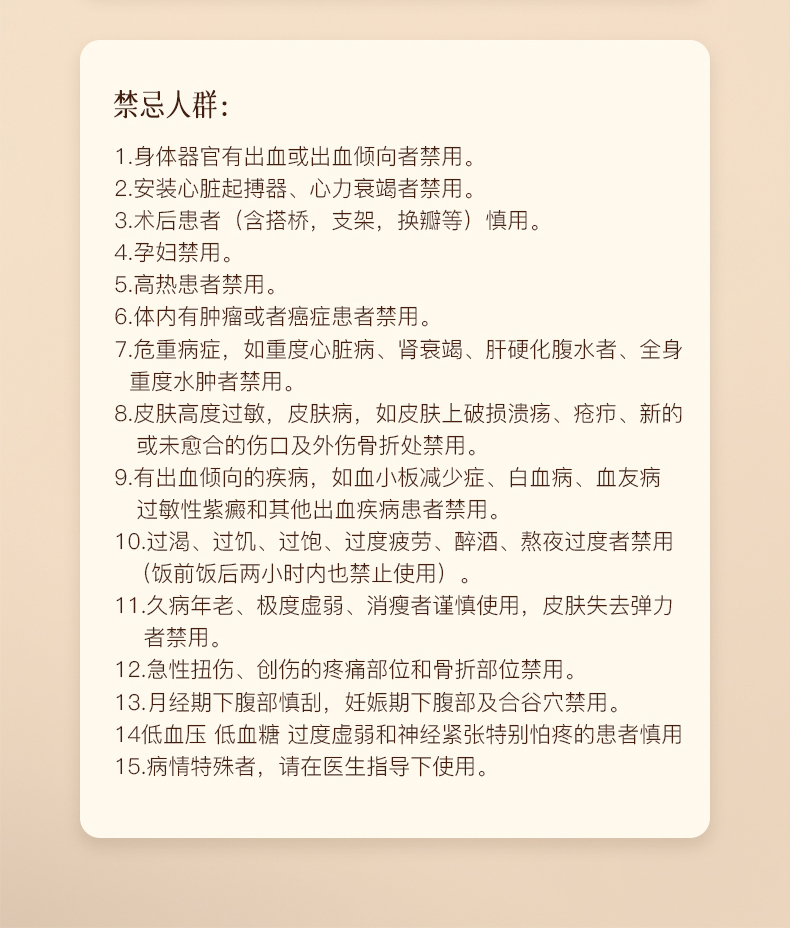 7.产品电极片具有发热表面,不得由不能自理人员、婴幼儿或对热不敏感的人使用。