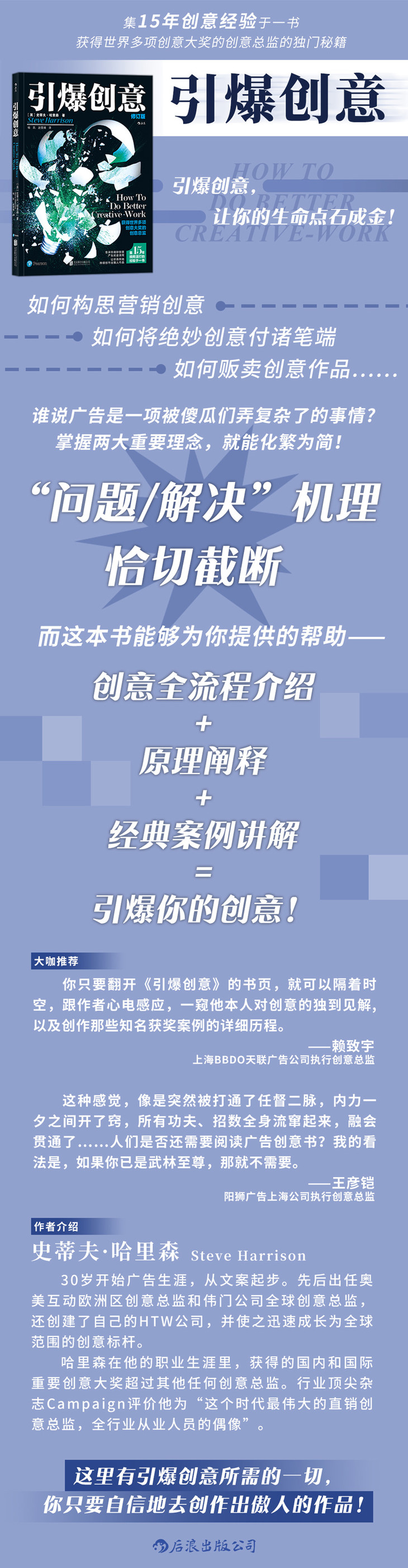 如何做出创意作品,不仅为客户所接受,还能获奖?如何针对不同的客户和媒介,一次又一次地创新?《引爆创意》即是作者作为15年的创意总监传授的独门秘技。