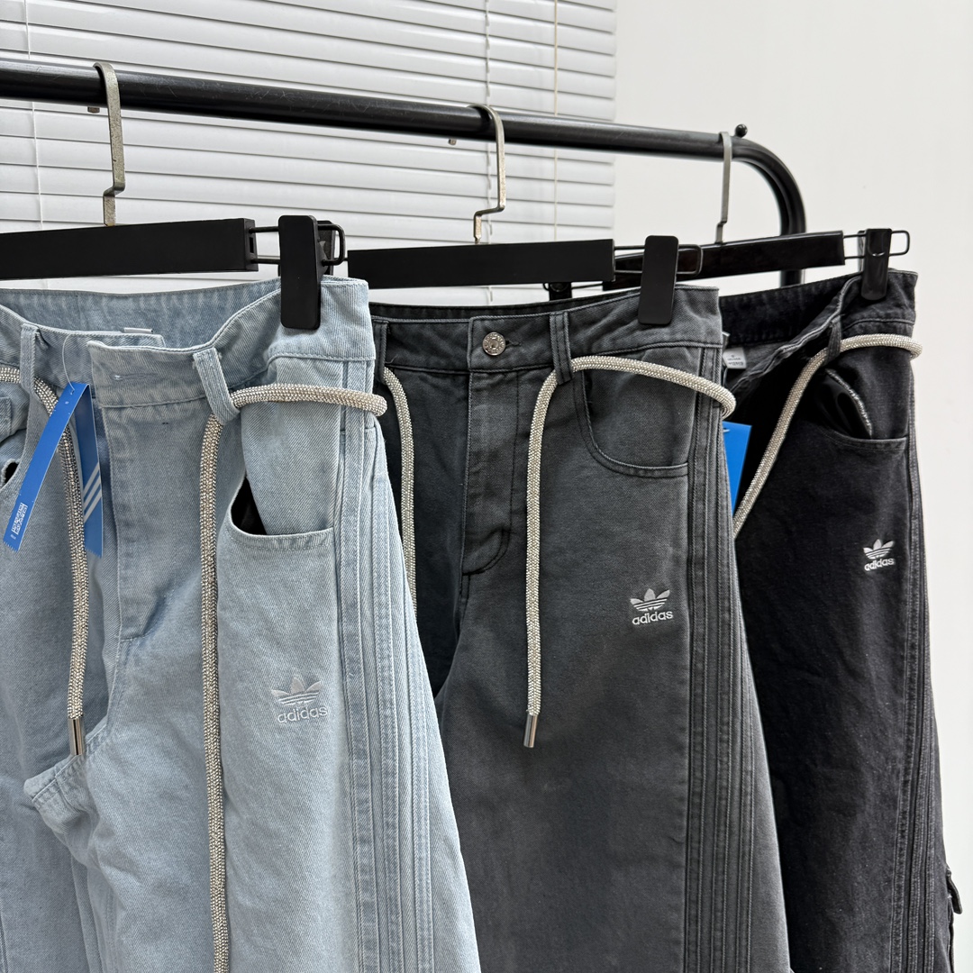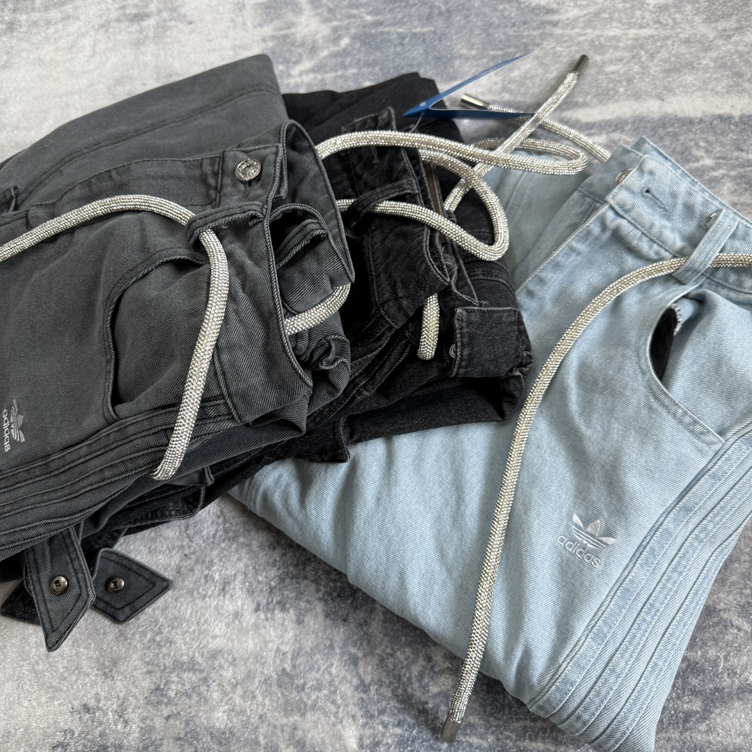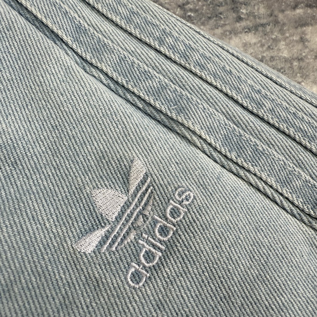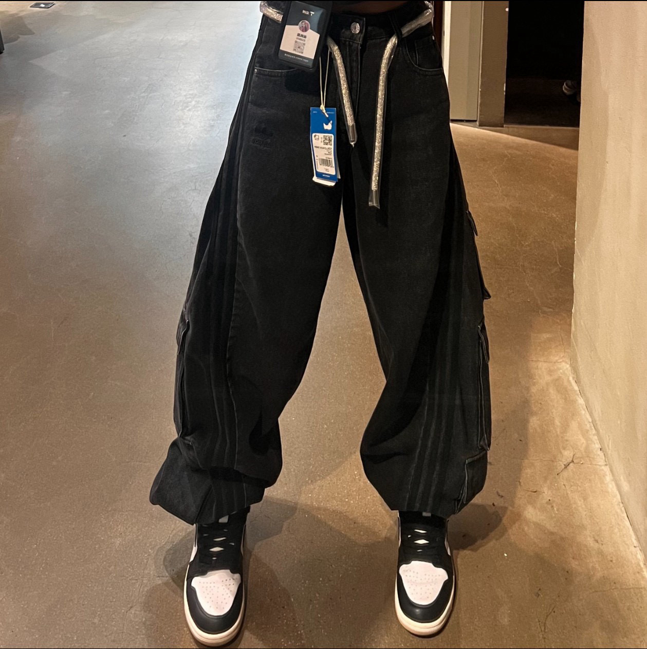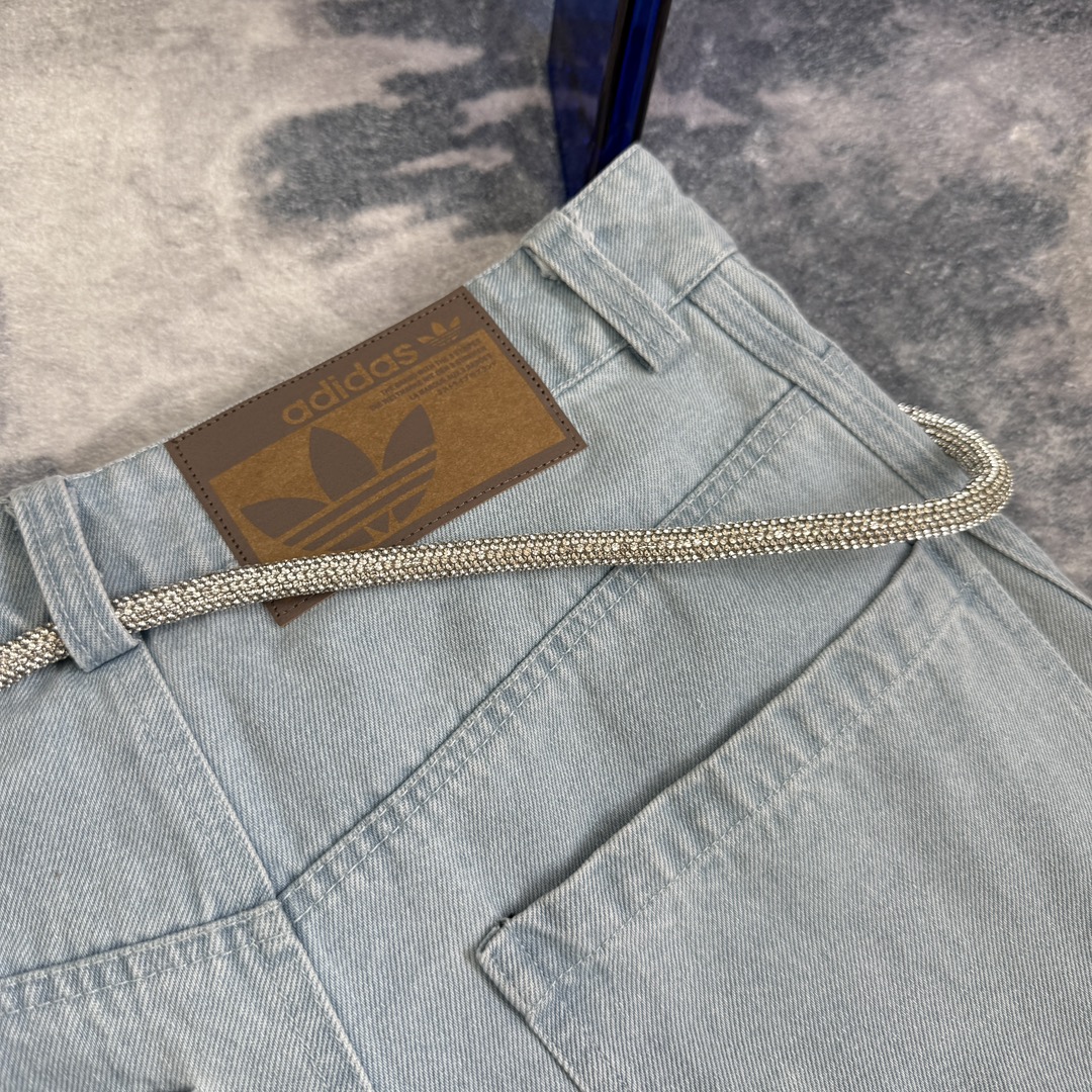 260 货号220785260 LL 【原版品质】adidas originals 阔腿工装多口袋钻石腰带三条杠宽松运动牛仔裤 女款 经典蓝 深灰 哑光黑