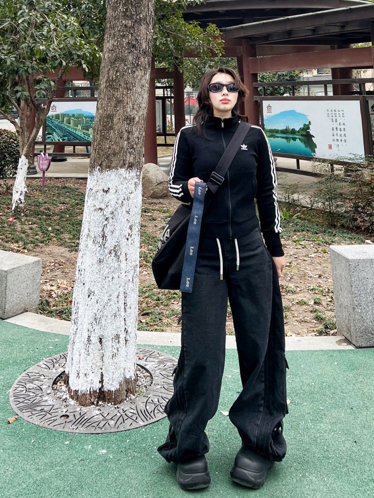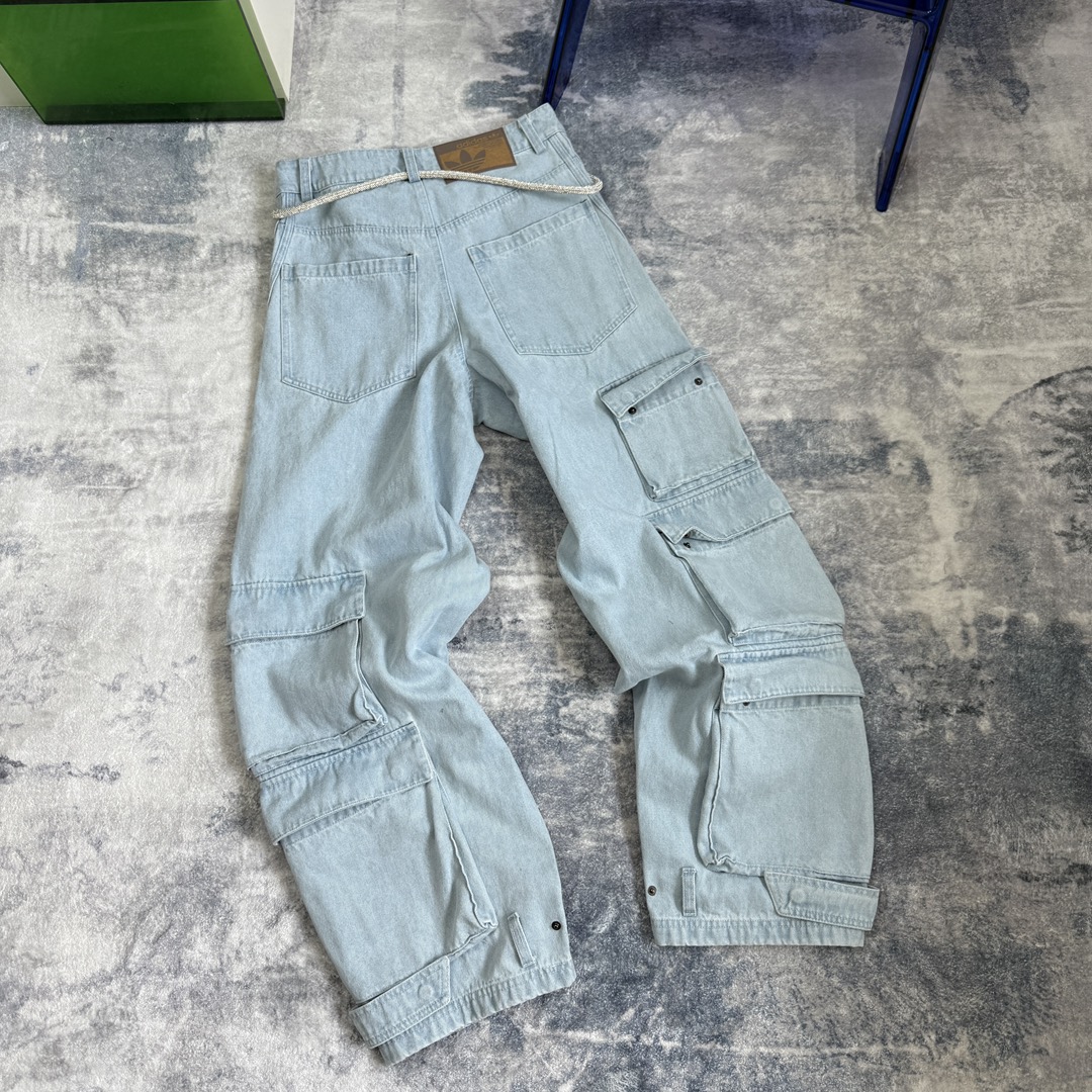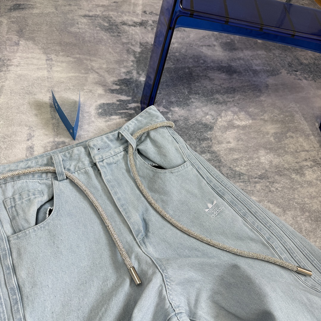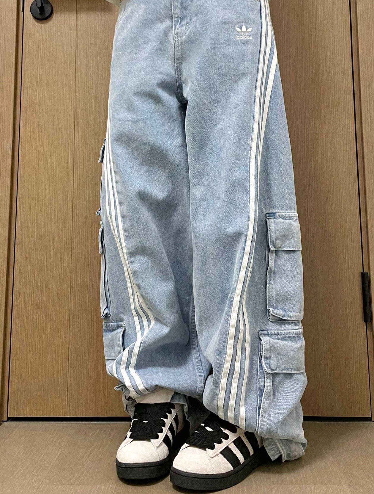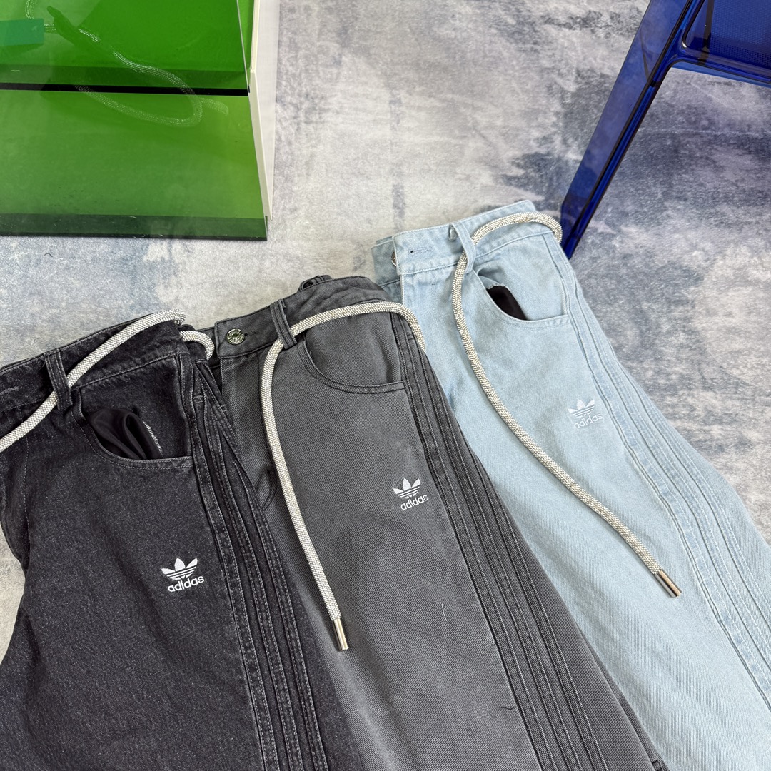 260 货号220785260 LL 【原版品质】adidas originals 阔腿工装多口袋钻石腰带三条杠宽松运动牛仔裤 女款 经典蓝 深灰 哑光黑