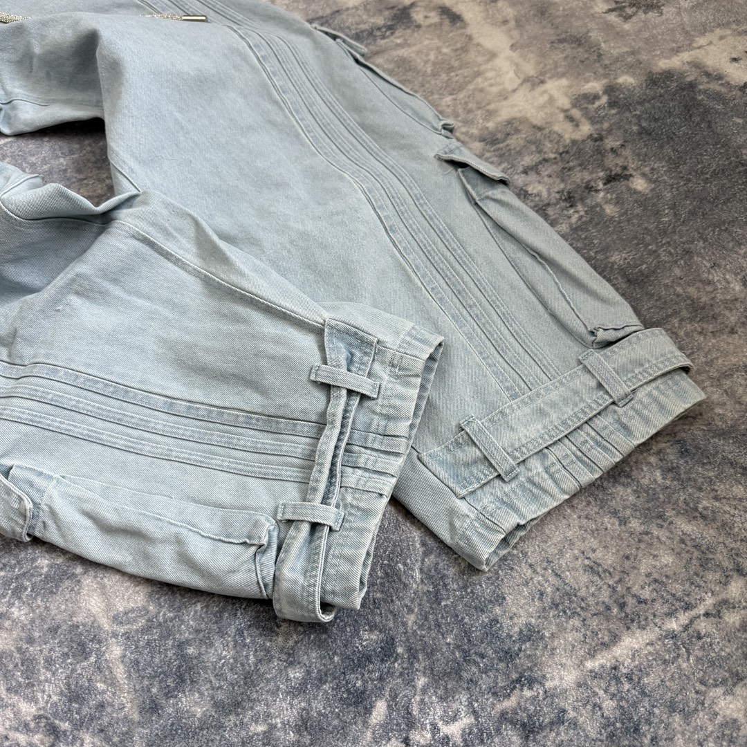 多功能口袋结构,双侧立体大容量工装贴袋+腿部立体插袋,辅以做旧金属铆钉加固,实用性与街头感并存;后腰隐藏式拉链口袋,提升随身物品安全性。