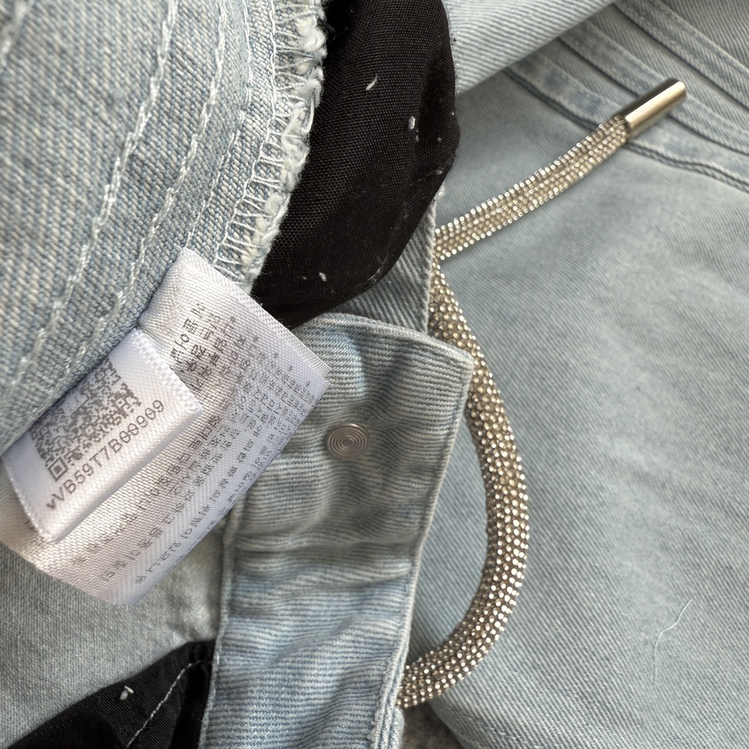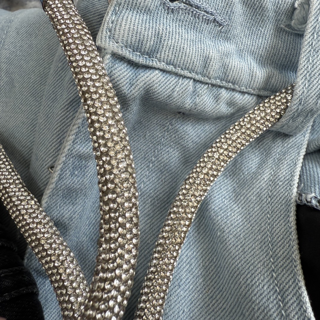 阔腿高腰版型,从腰部至裤脚呈现流畅的A字廓形,包容多种腿型,显瘦显高;高腰设计贴合腰腹曲线,搭配烫钻腰带,闪耀不易脱落。增添复古工装细节。