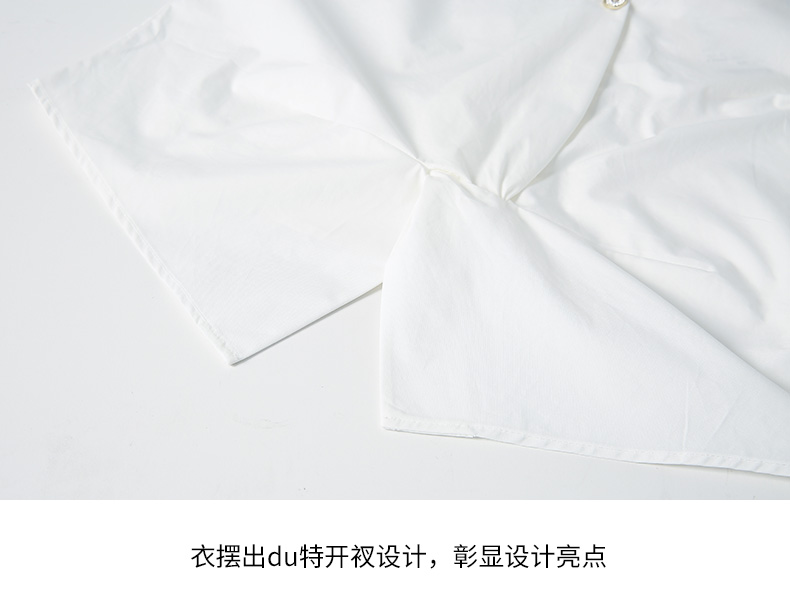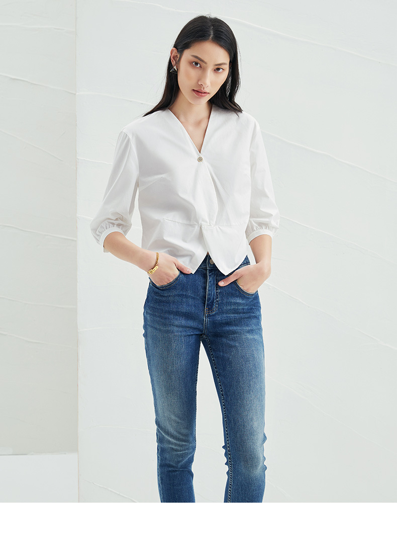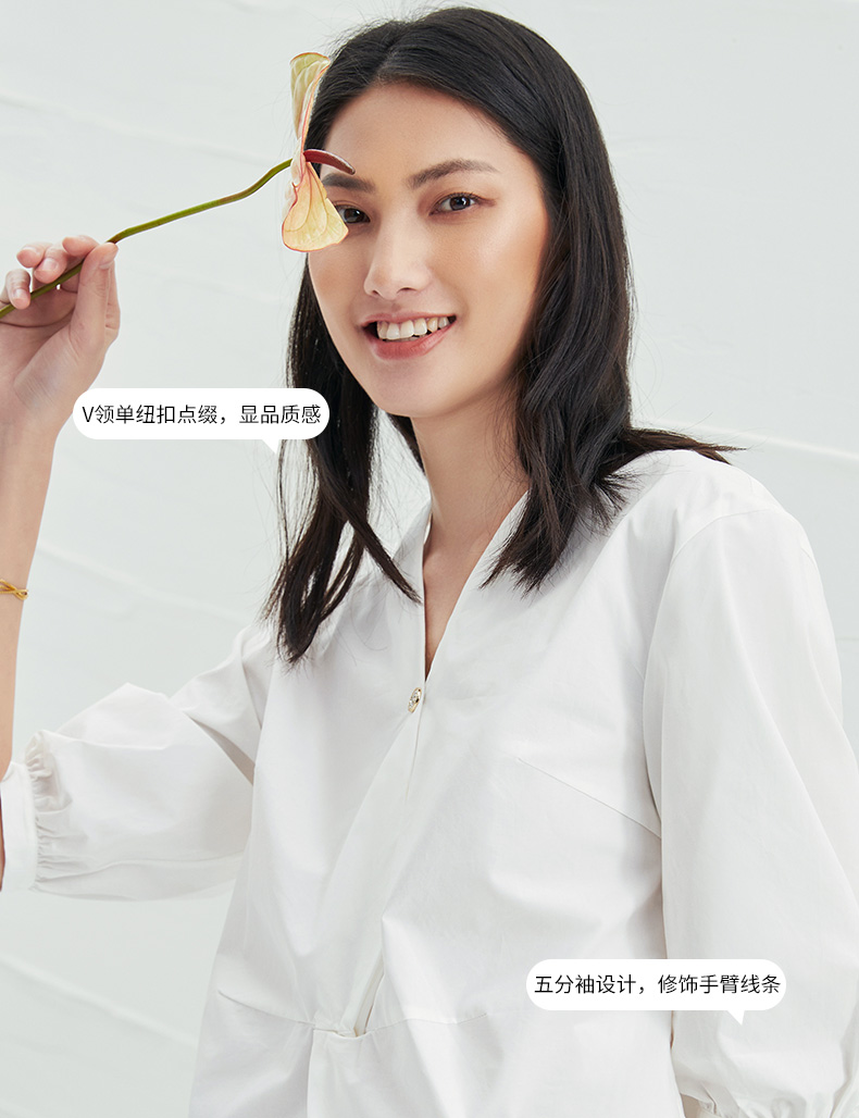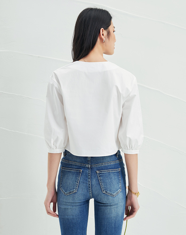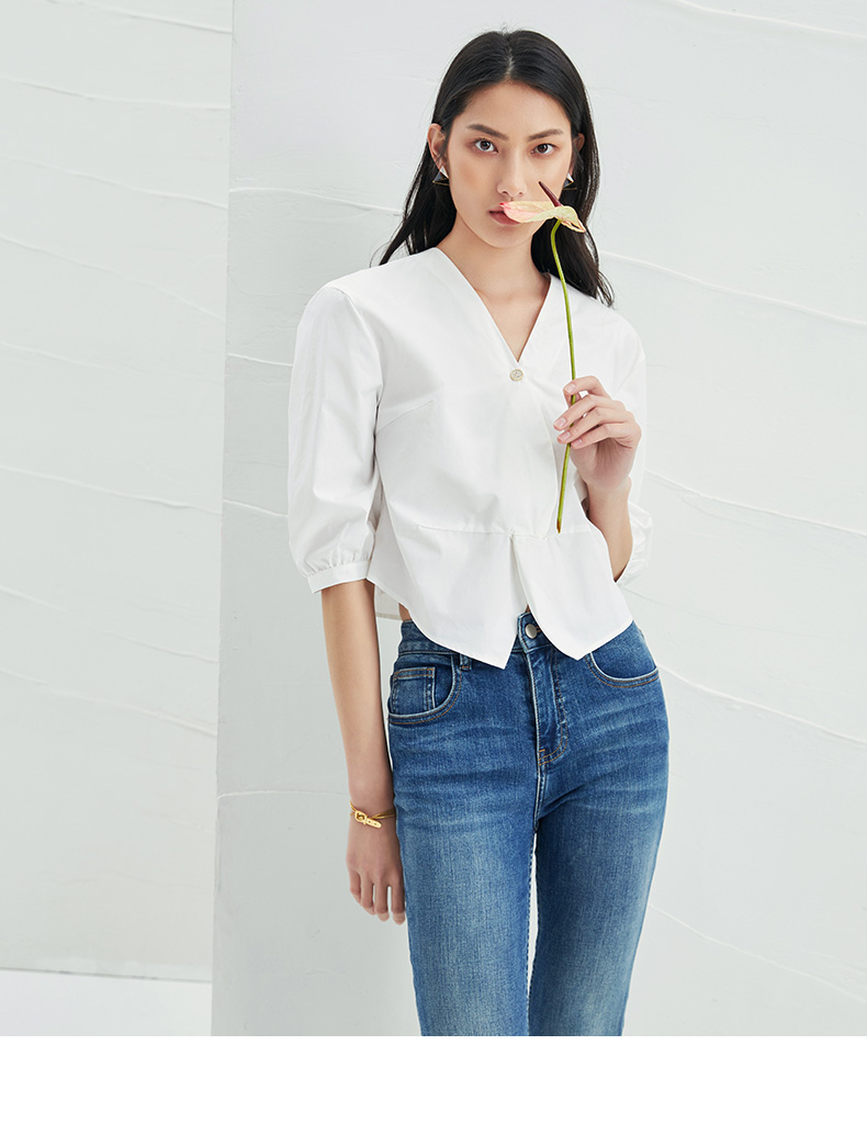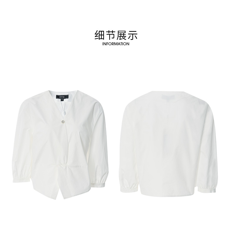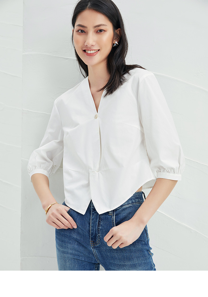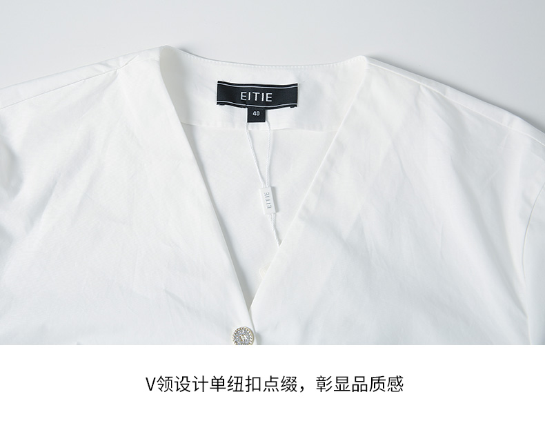 EITIE爱特爱夏季新款通勤显瘦百搭衬衫纯棉白色v领宽松短上衣B2213902
