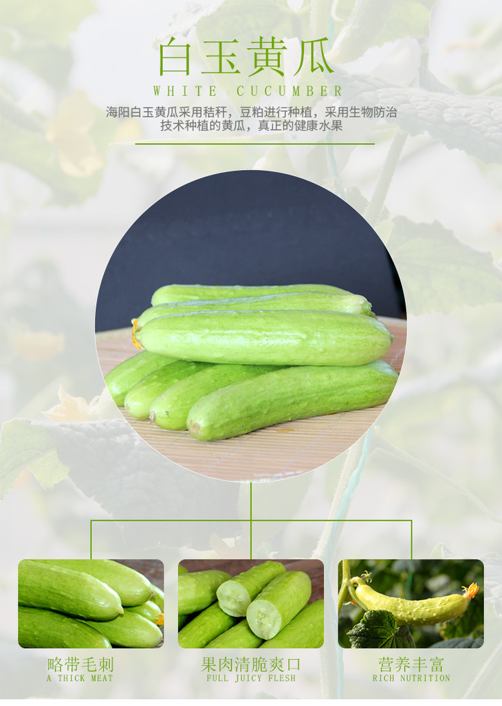 海阳白玉黄瓜兼有水果的特征,白皮晶莹亮白,表皮生长小刺,轻微磕碰划痕不在售后范围内!