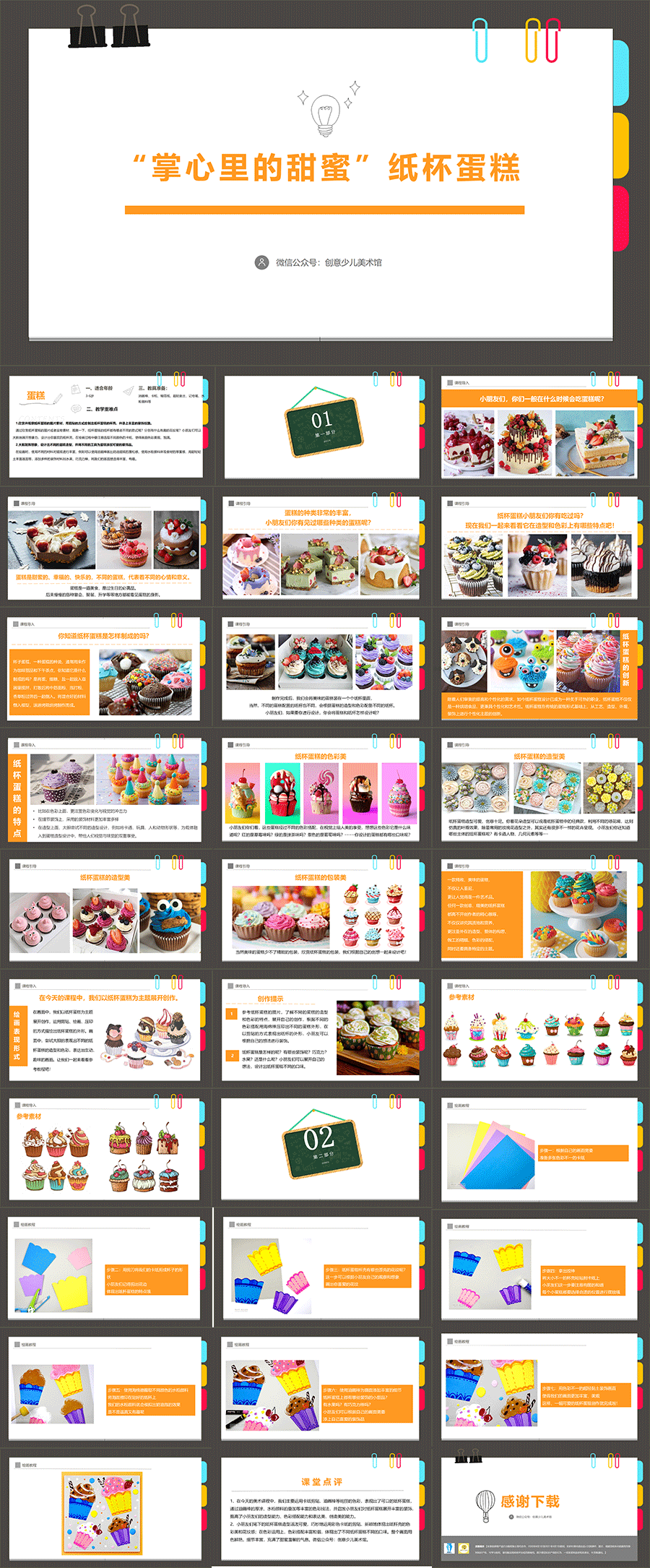 通过欣赏纸杯蛋糕的图片或者实物素材,观察一下,纸杯蛋糕的纸杯都有哪些不同的款式呢?分别有什么有趣的花纹呢?小朋友们可以大胆地展开想象力,设计出你喜欢的纸杯壳,在绘画过程中要注意选取不同颜色的卡纸,使得画面色彩美观、饱满。