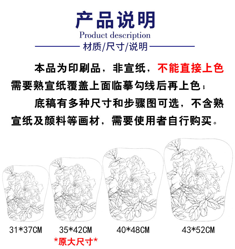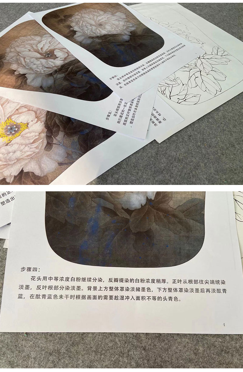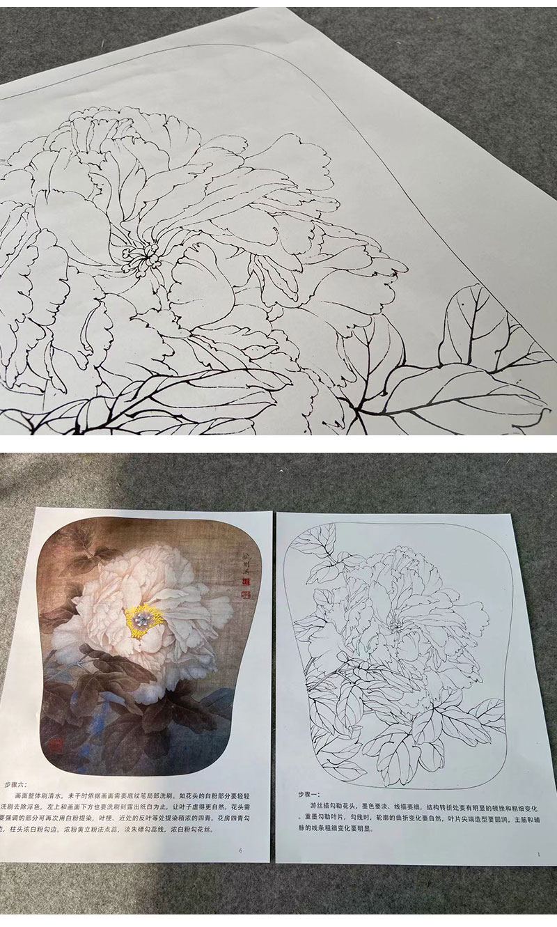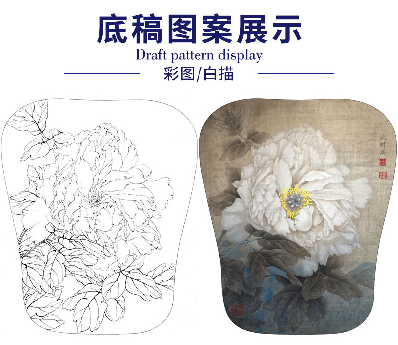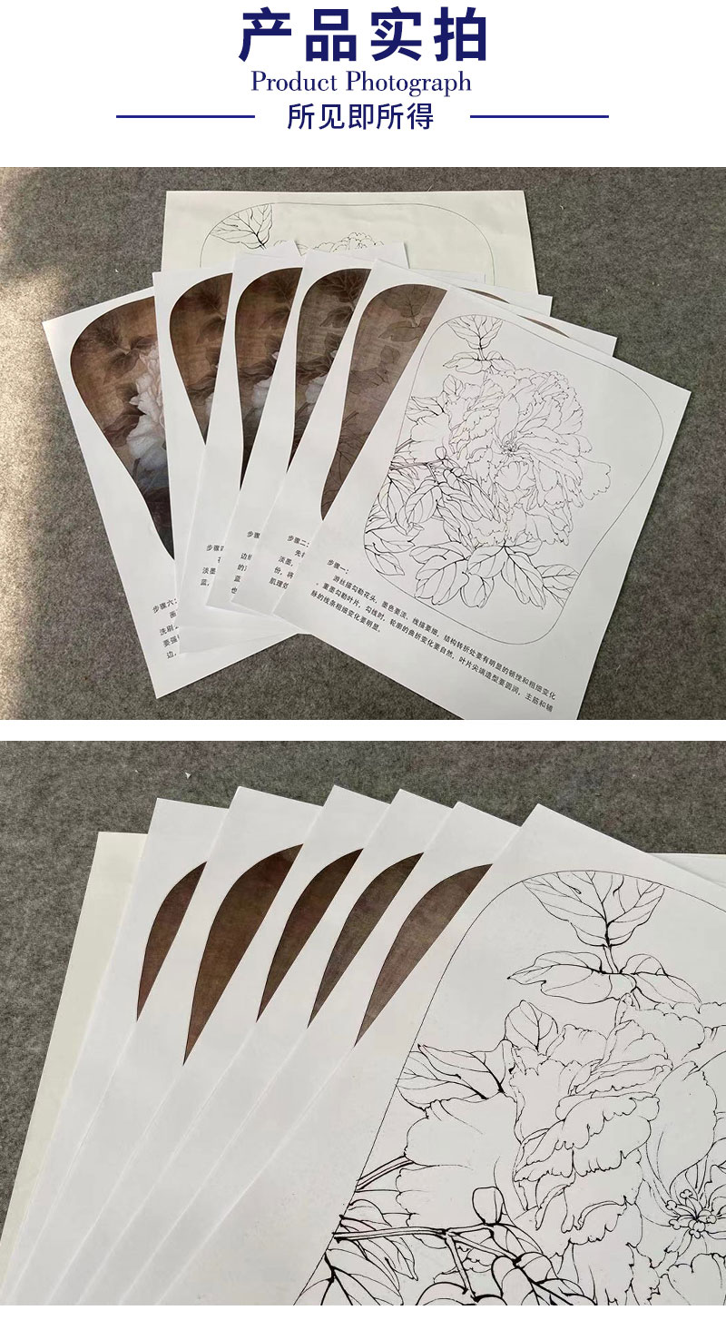 【有步骤、大彩图】李晓明工笔画白描底稿宫扇小品《琉璃冠珠》牡丹初学者临摹花鸟线稿KD08
