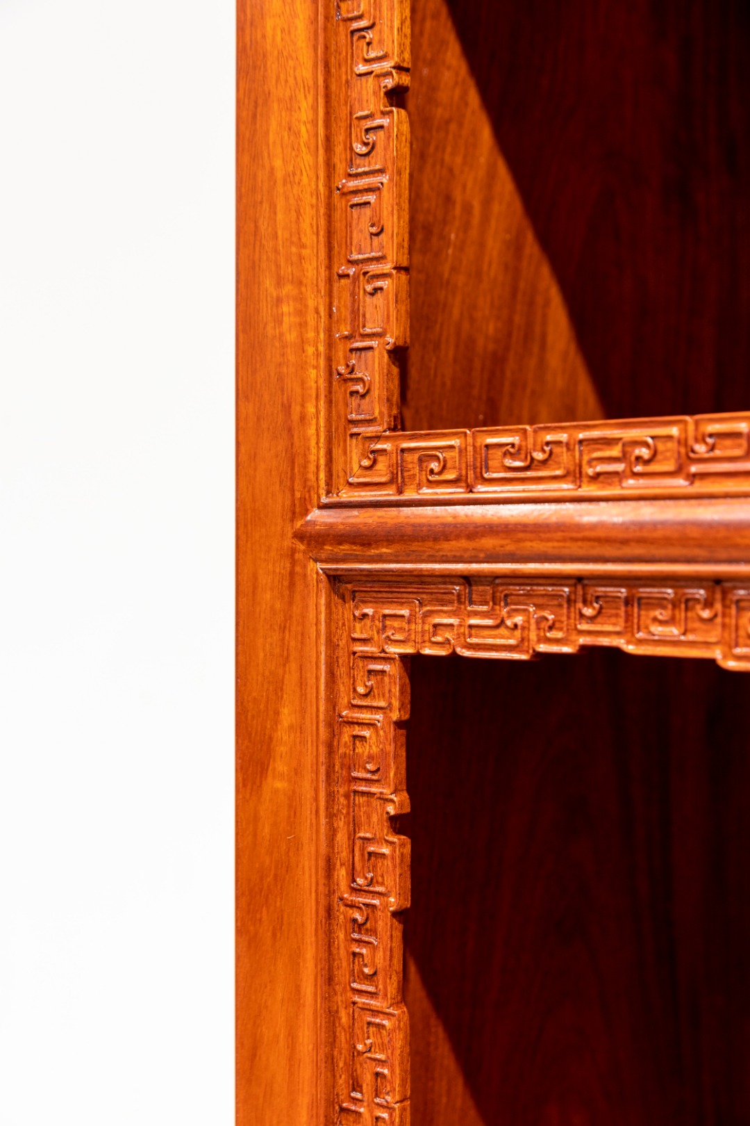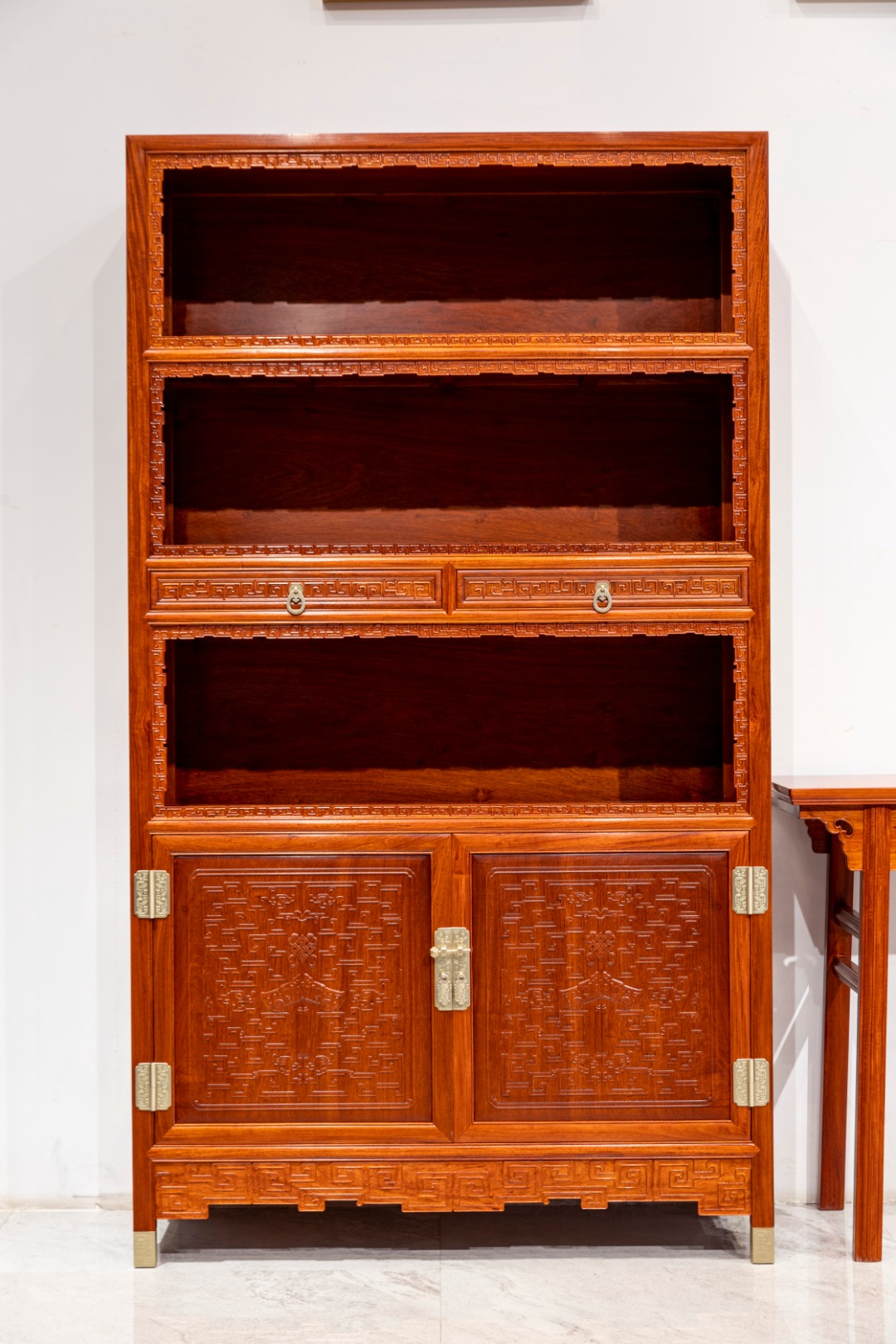 上格三层亮格,正面圈口上雕拐子纹。第二、三层亮格间置两具窄长的抽屉,下部为柜,对开柜门,面板上打洼一委角方框,内铲地浮雕夔龙捧磬纹,夔龙的身躯布满纹饰框。柜格正面纹饰线条均打洼双线。柜格侧板分两层,每层侧板上起鼓委角方框,内露地浅浮雕流云百蝠纹。背板也分两层,落堂镶板,中部起圆角方框。底部四圈安洼堂肚宽牙条,正面及侧面牙条铲地浮雕拐子纹,背面牙条起卷云纹。面页、合页、护脚等铜构件,采用定制级铜活儿,纹理錾刻提精聚神,起画龙点睛之笔。