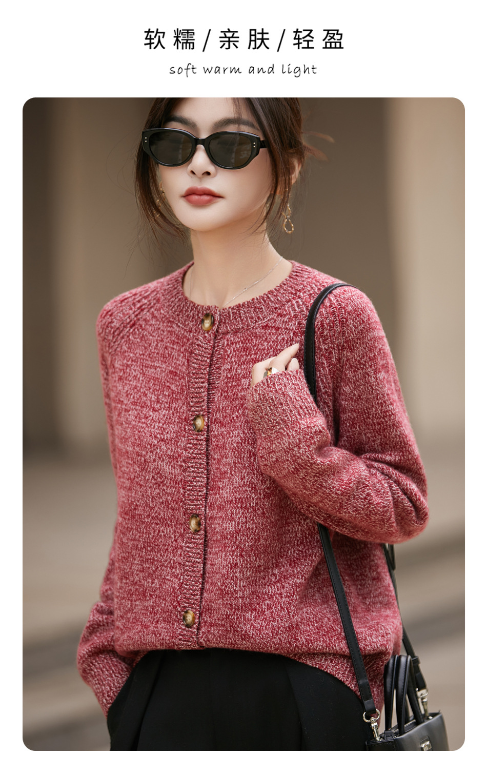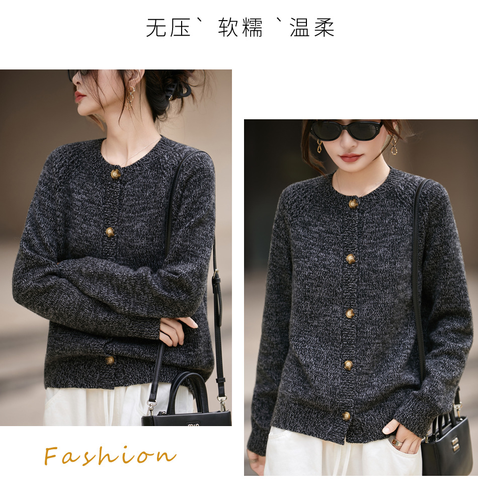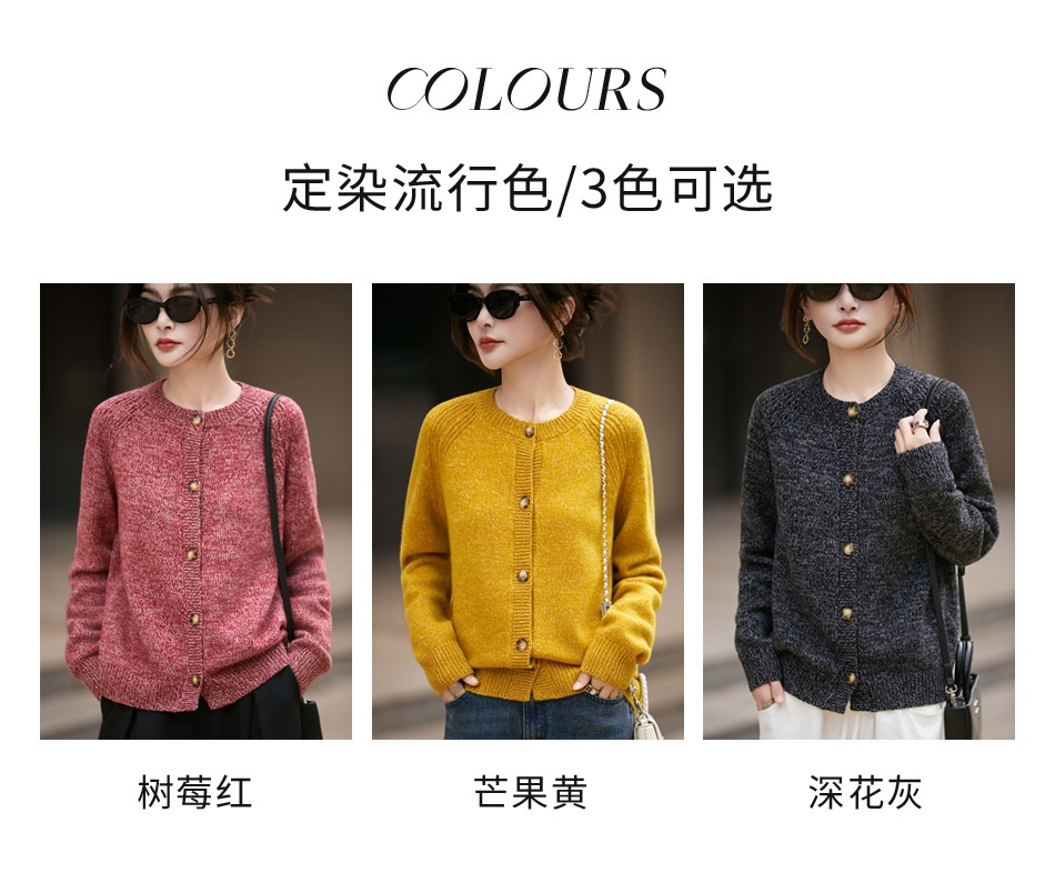 丁摩 100%纯羊毛春季新女式圆领条纹拼色宽松系扣打底针织开衫外套6ZF-299