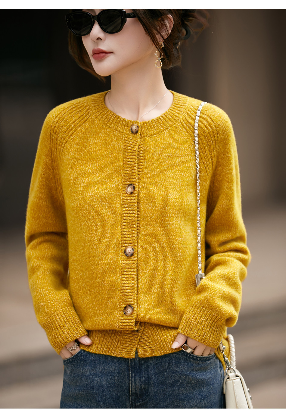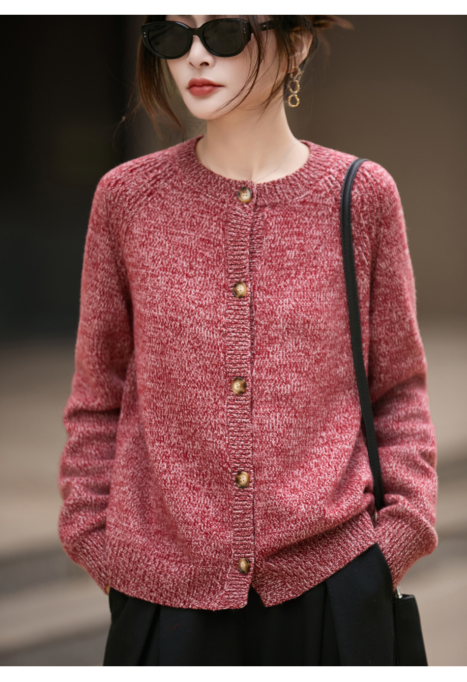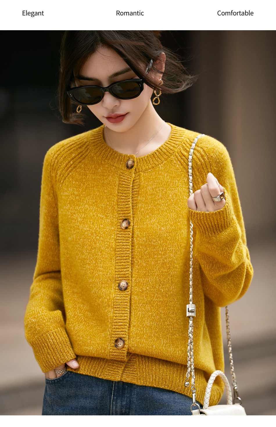 丁摩 100%纯羊毛春季新女式圆领条纹拼色宽松系扣打底针织开衫外套6ZF-299