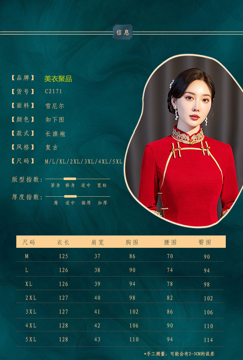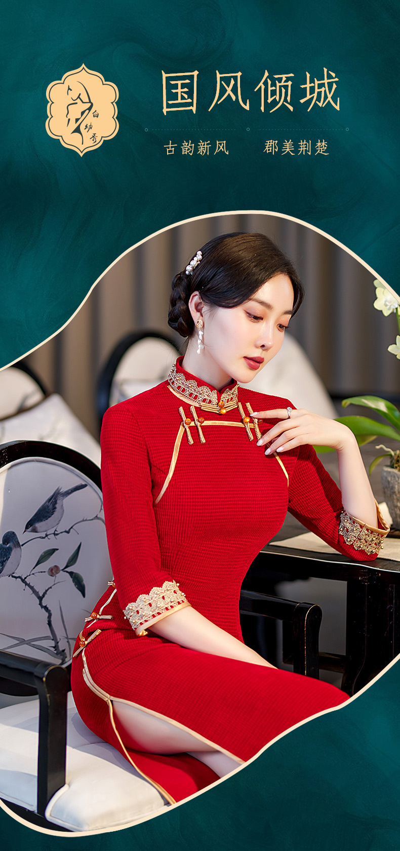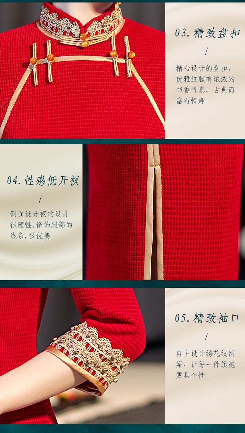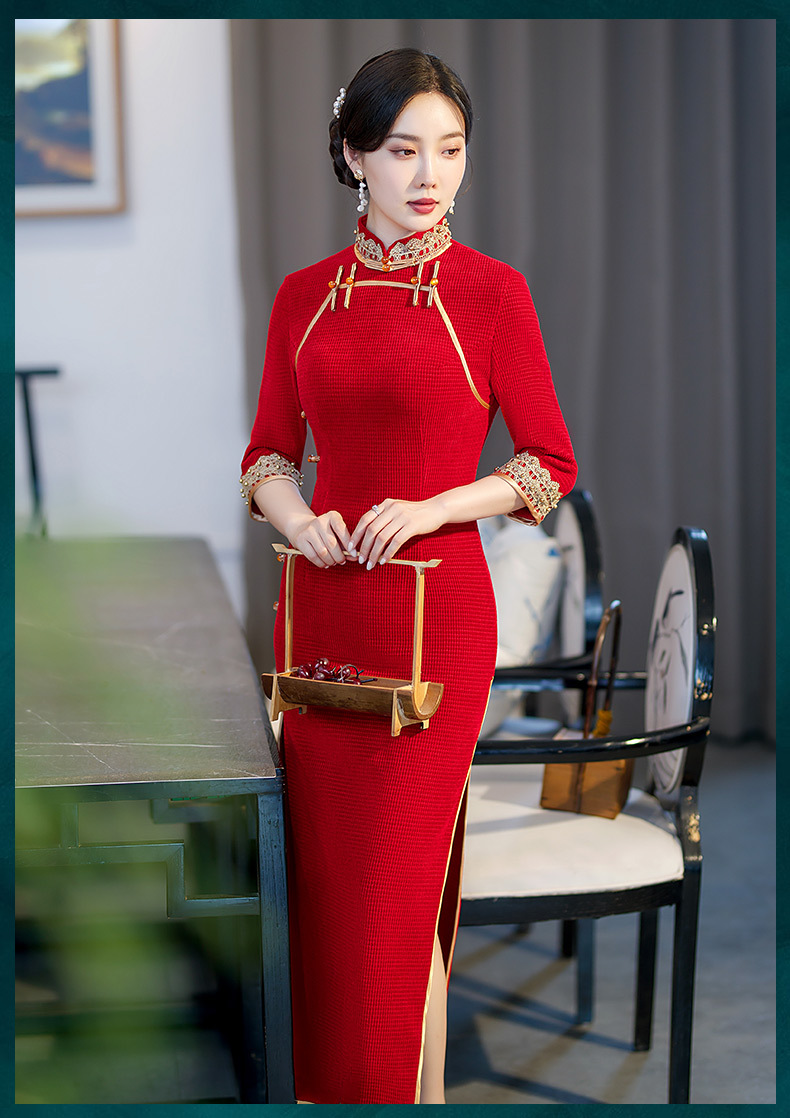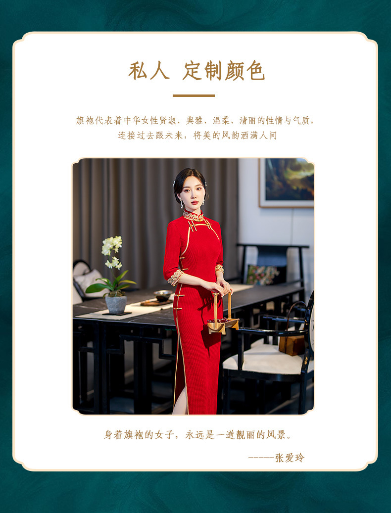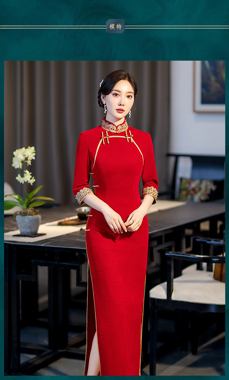 新款立领七分袖中式红色长款高开叉修身旗袍ST-C2171