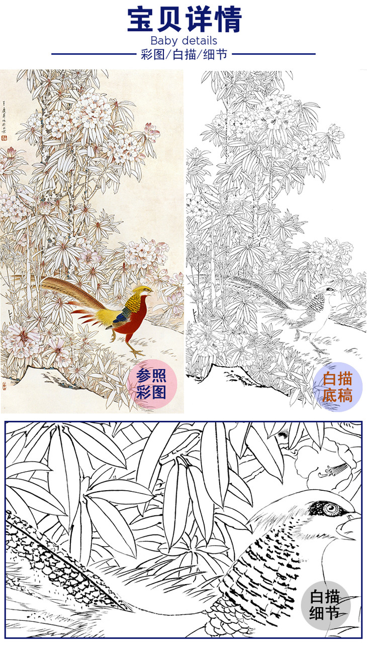 四尺六尺竖幅工笔花鸟白描底稿-王庆升杜鹃锦鸡-RT01