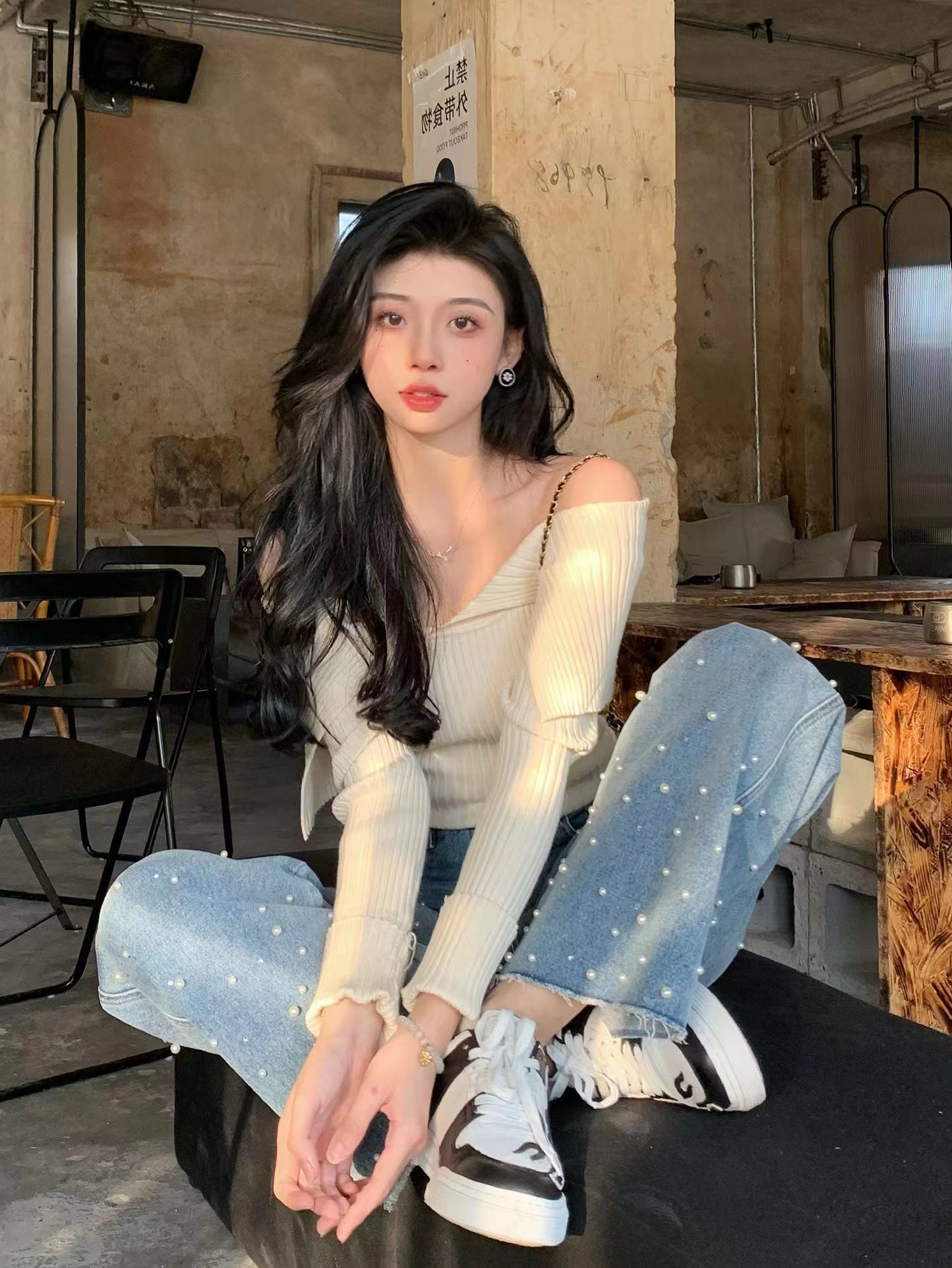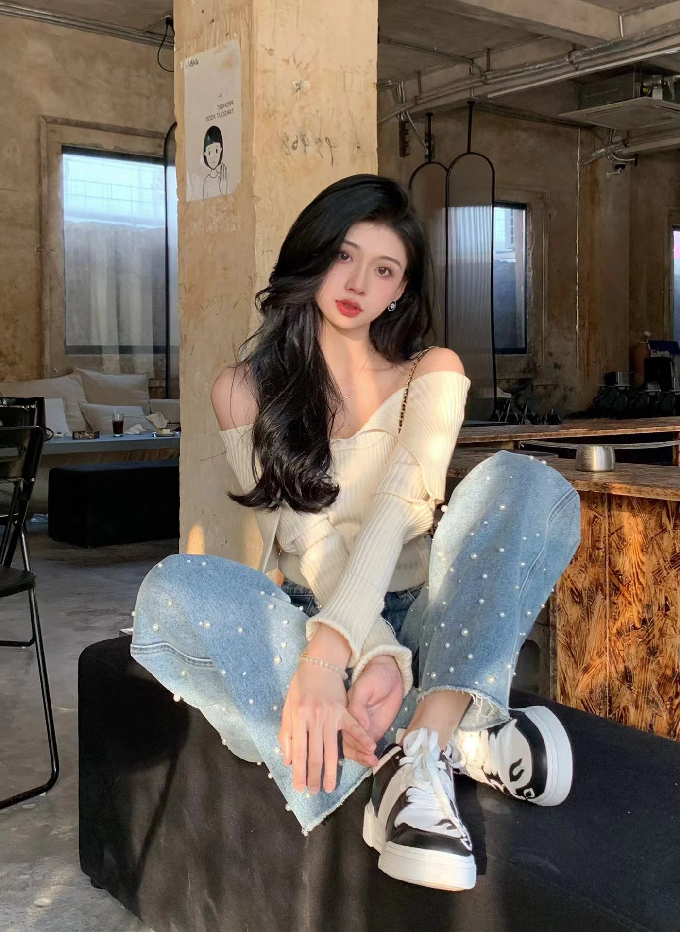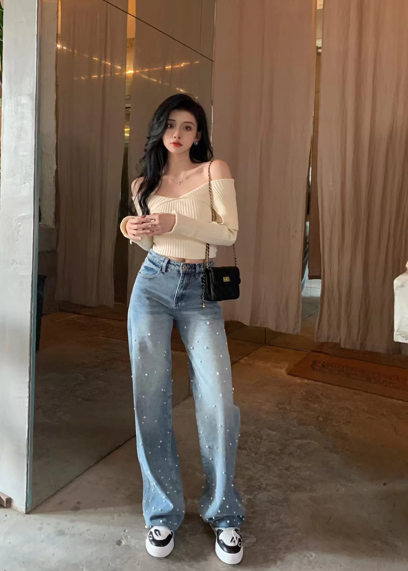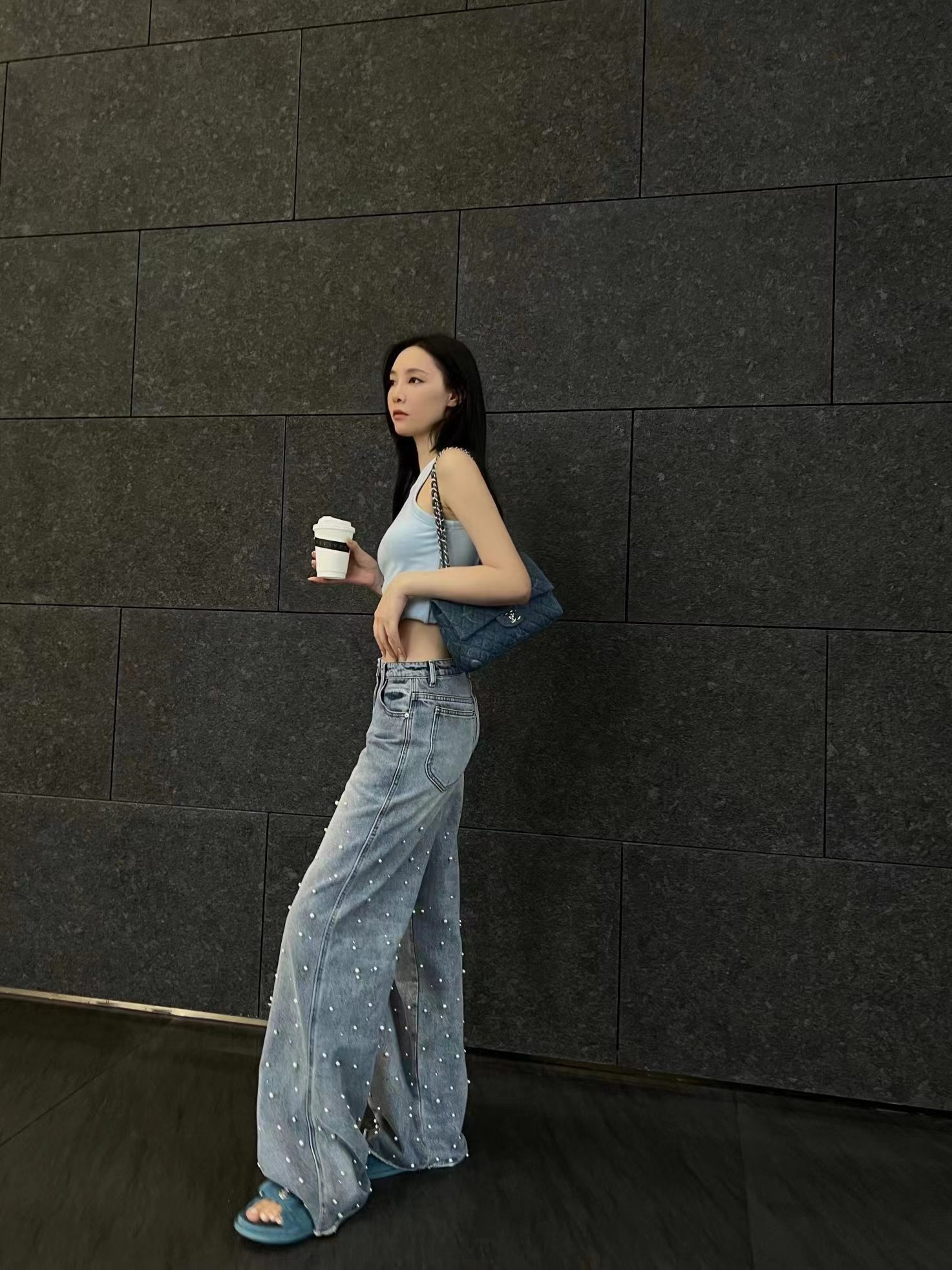 分镜头集成店LOOSINGWHITE春夏系列珍珠直筒牛仔裤