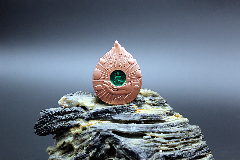 地藏王菩萨纪念章外形均采用火焰造型,火焰纹在佛教中体现佛菩萨的灵光和法力,有神圣、威严、降魔等含义。