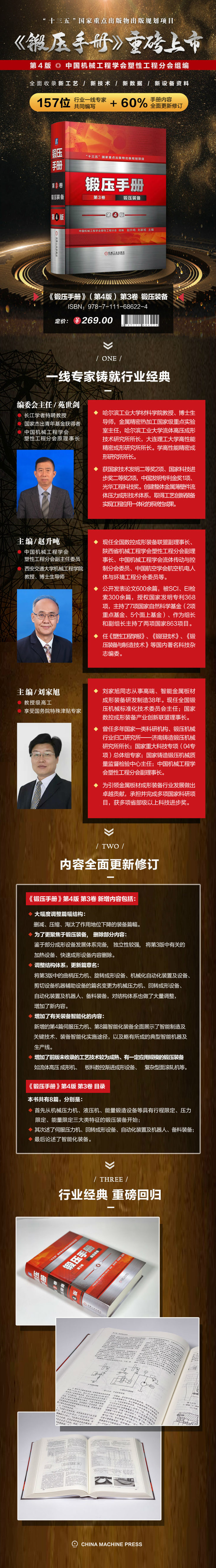 中国机械工程学会塑性工程(锻压)分会于1993年组织编写并出版了《锻压手册第3卷锻压车间设备》,并于2002年、2008年、2013年分别修订出版了第2版、第3版、第3版修订本。《锻压手册第3卷锻压装备》第4版由来自我国不同类型锻压设备的研发水平名列前茅的高校、企业/研究所45家(高校14所、企业/研究所31家)共157位(高校46人、企业/研究所111人)专家、学者编撰而成,参与编写的企业、研究所的数量和人数均超过了2/3。本卷结构、内容变化显著,基本为重构、新增或更新内容,对第3版内容进行了大幅度删除、缩减、更新,增加了大量智能化相关内容,由原来的10篇69章变为现在的8篇48章,因此对卷的名称也做了一定调整。