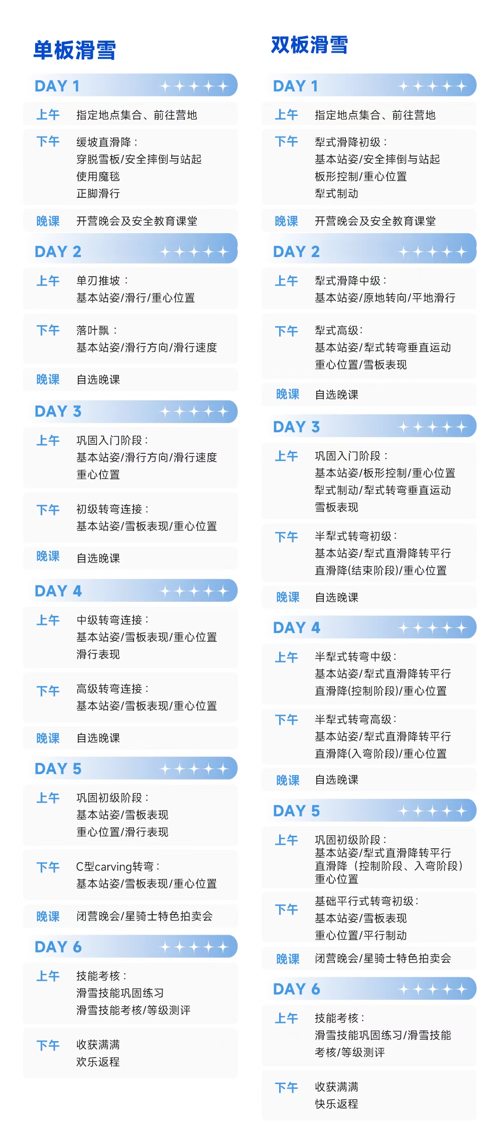 6天5晚的营期时间内,我们将带孩子们学习炫酷滑雪技能、体验快乐滑雪!