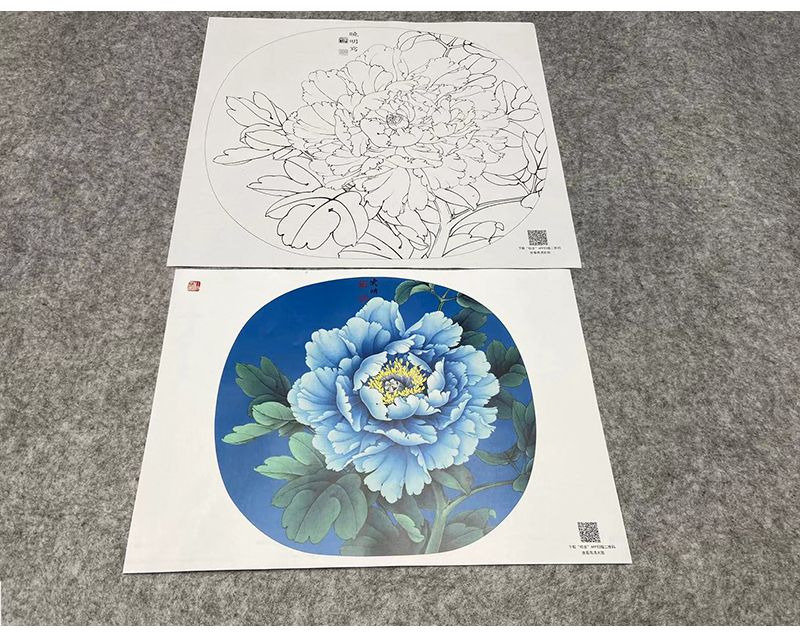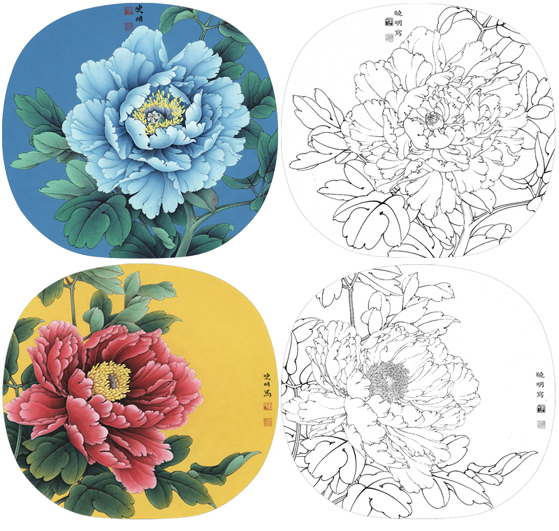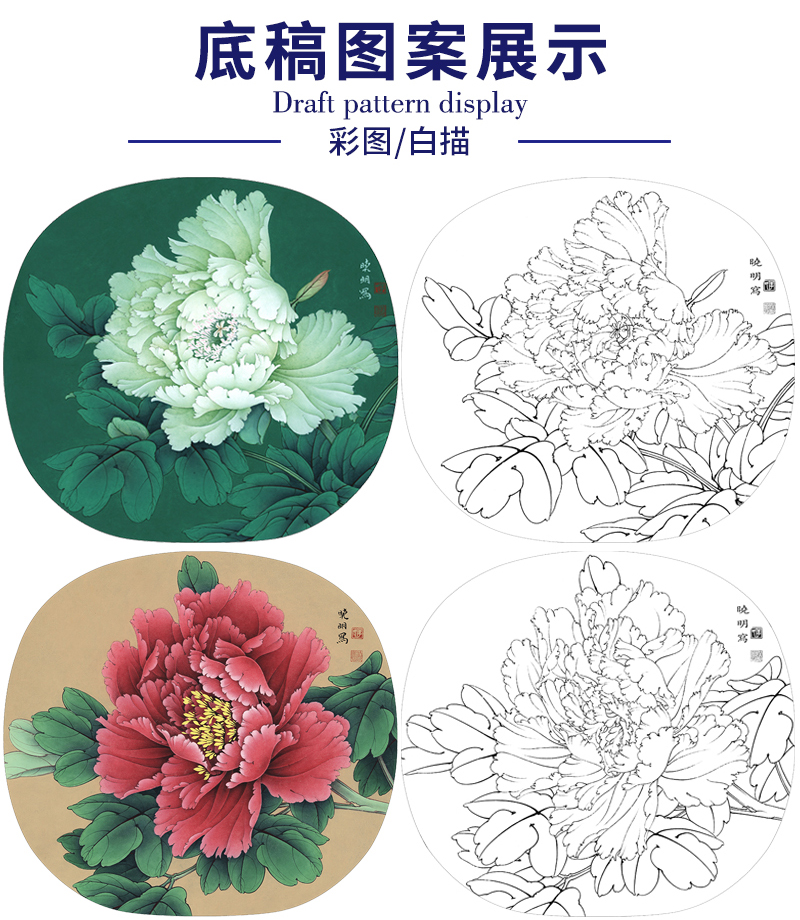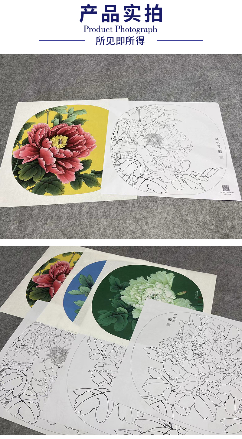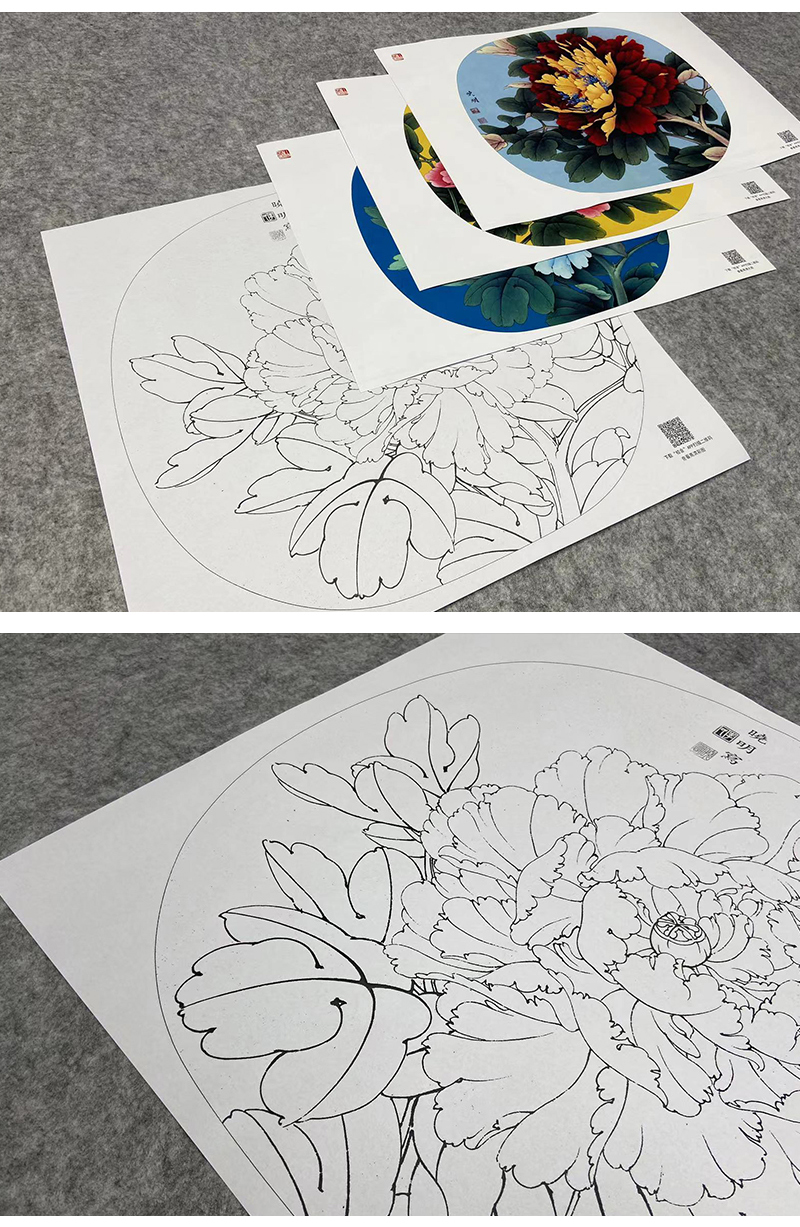 李晓明工笔花鸟画白描底稿牡丹一套十二幅册页尺寸38×41厘米花鸟线稿KF22
