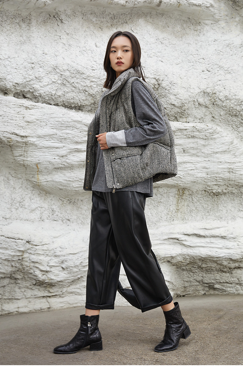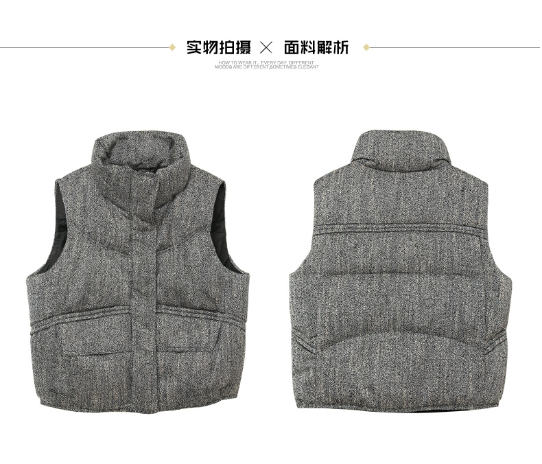 秋冬新款灰色立领羽绒马甲女复古粗花呢面料宽松显瘦外穿背心外套