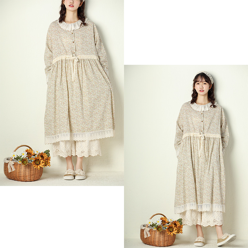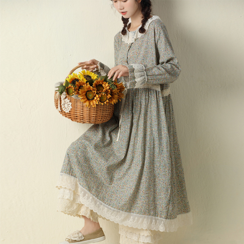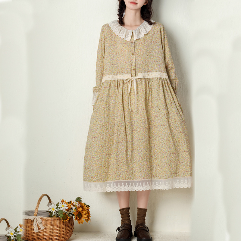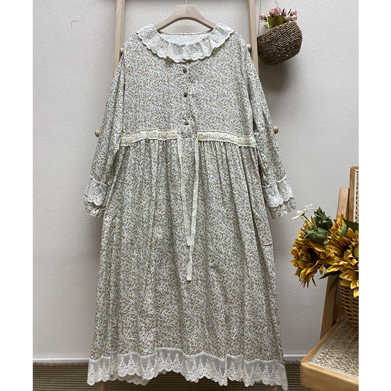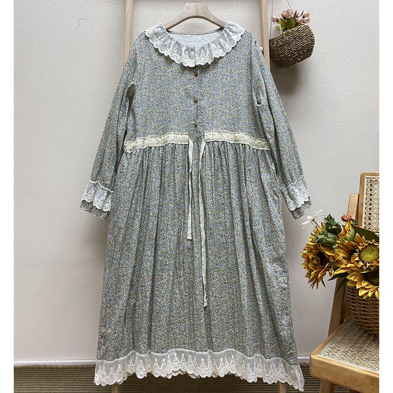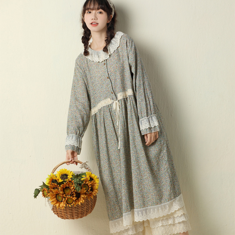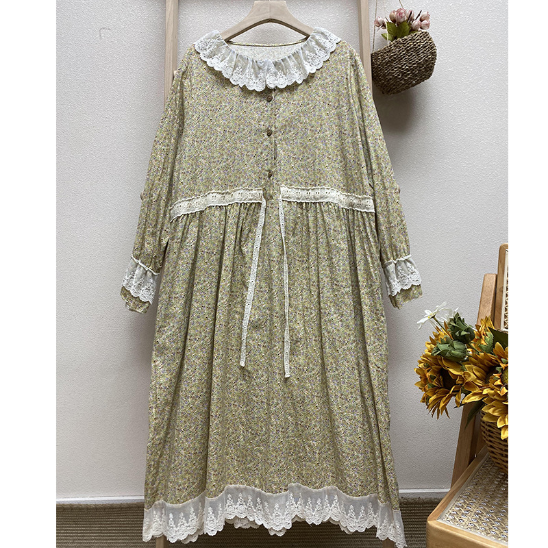 WQ-8802新款春装日系清新蕾丝娃娃领棉麻碎花长裙宽松长袖抽绳连衣裙