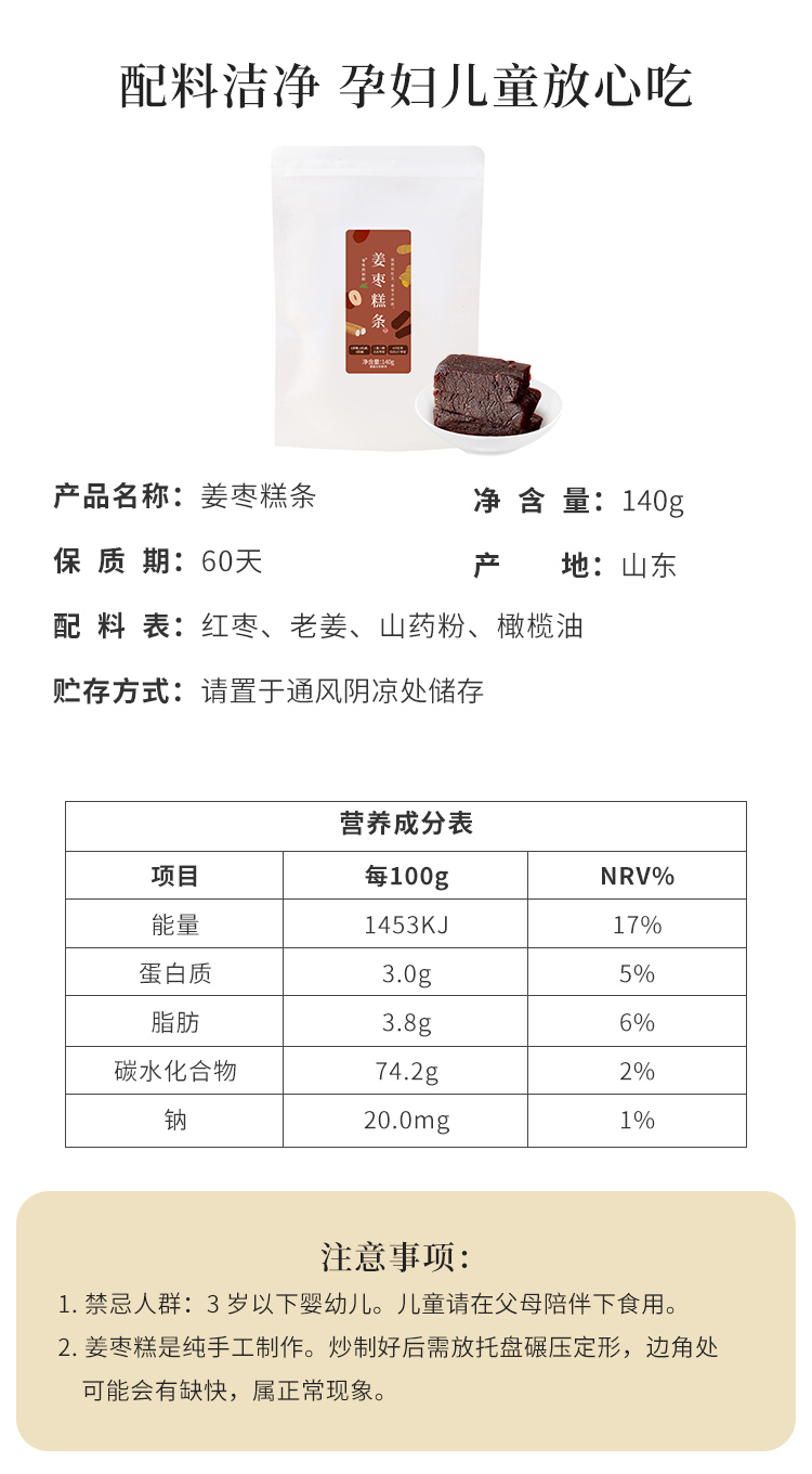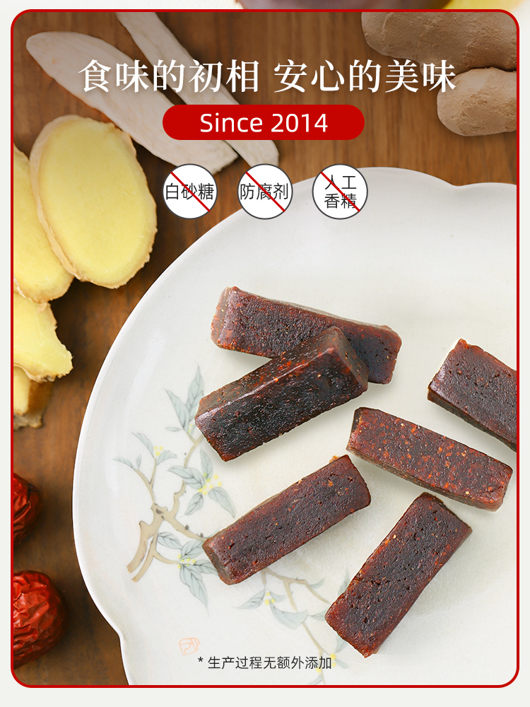 【斌哥优选】姜枣糕条。配料只有枣泥,姜丝,山药粉,橄榄油。不额外加糖。把外泄的阳气补进身体里。独立包装,方便携带。