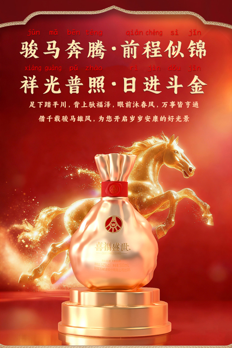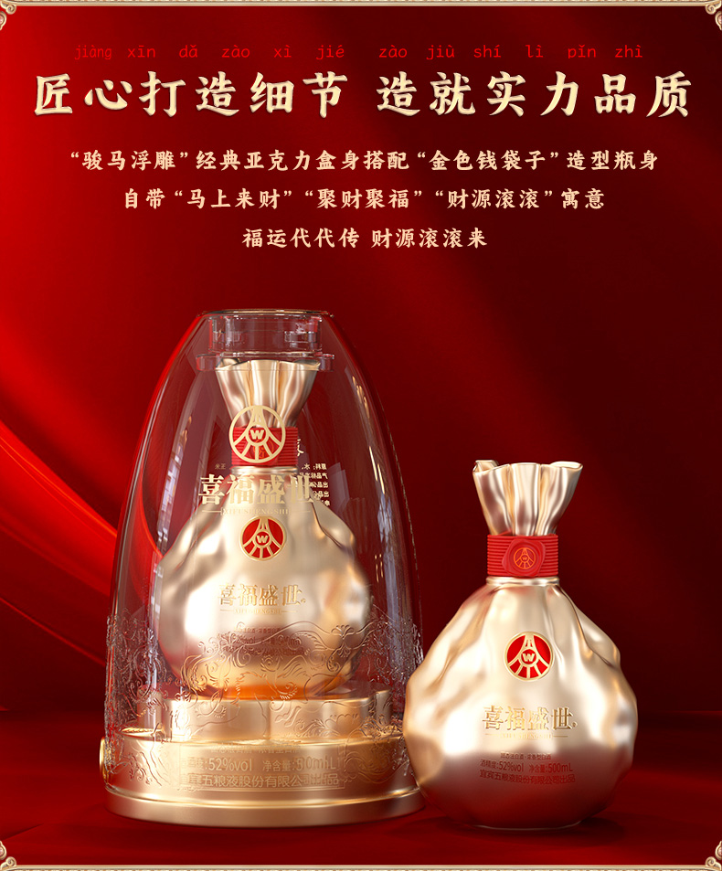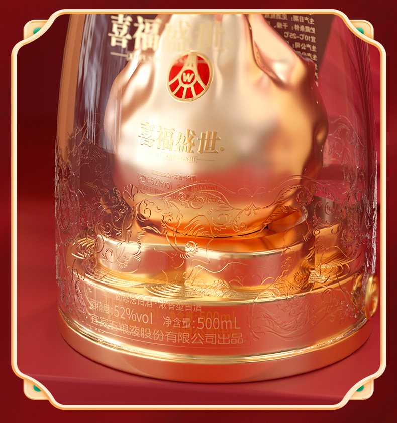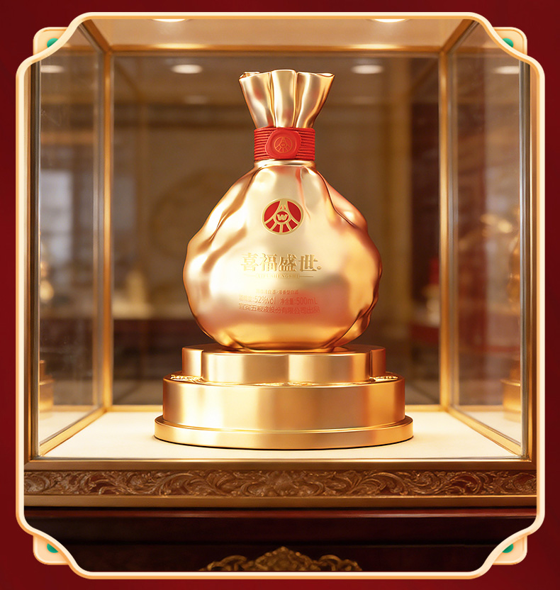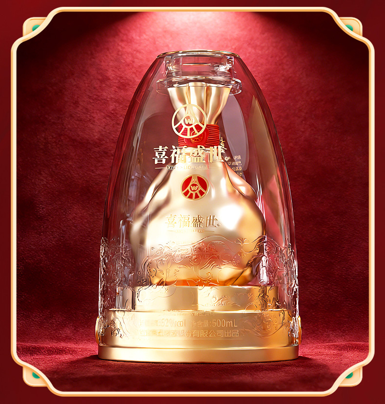 【年货节会员专享】五粮液股份出品 浓香型优级 喜福盛世 52度 500mL 2瓶 聚财金樽双支装