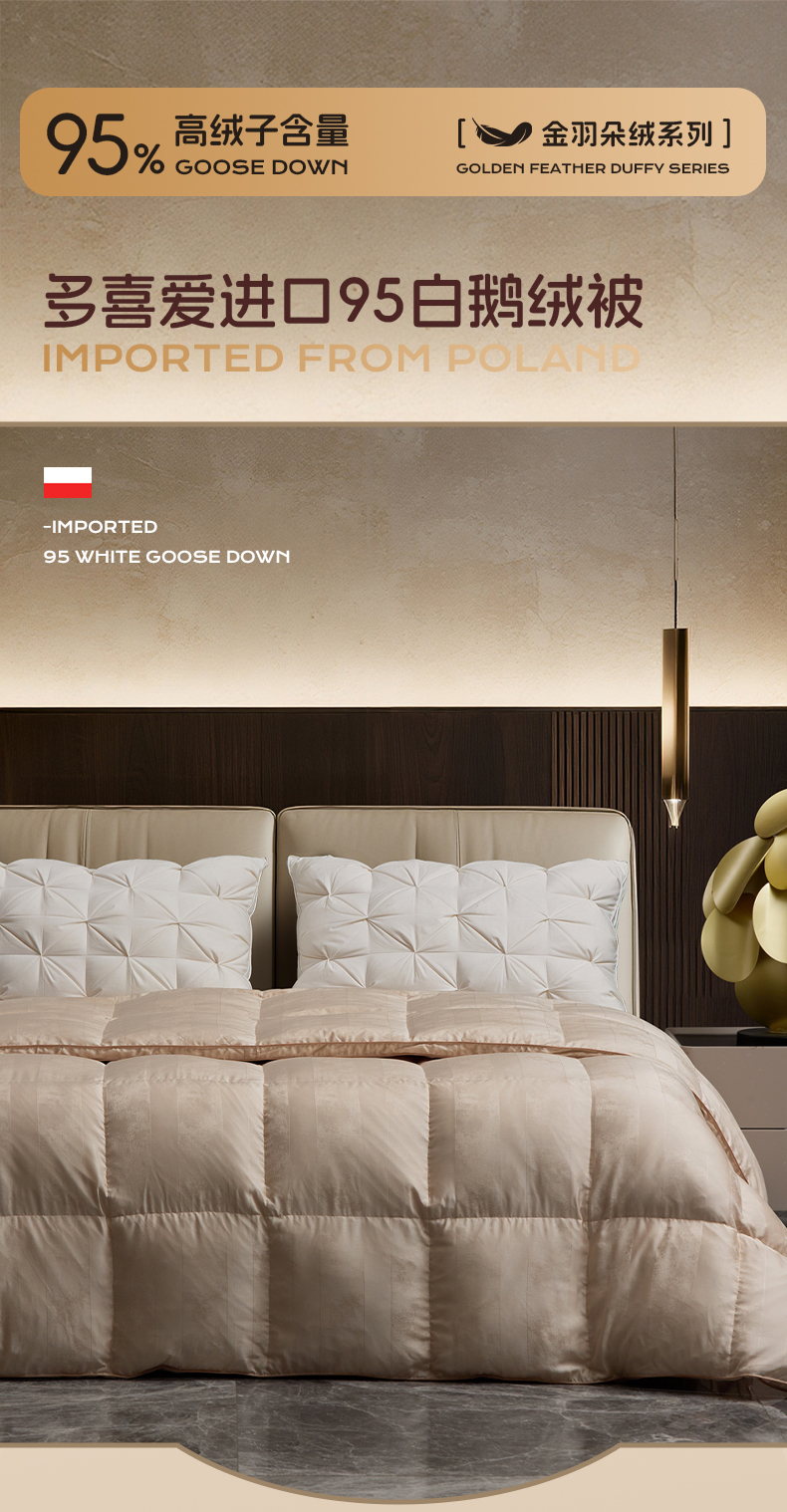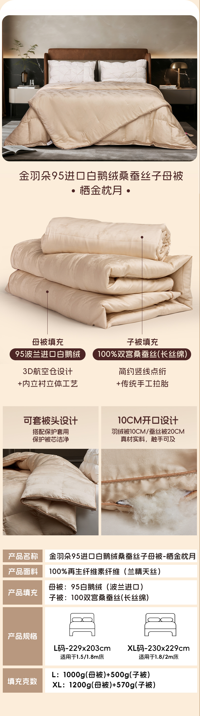 多喜爱 金羽朵95进口白鹅绒冬被/白鹅绒桑蚕丝子母被 -鎏光暖域/栖金枕月hl【95%绒子含量】【1000+清洁度】【波兰进口】【60S兰精天丝】【贡缎面料】银丝提花工艺 3D航空舱 10CM开口
