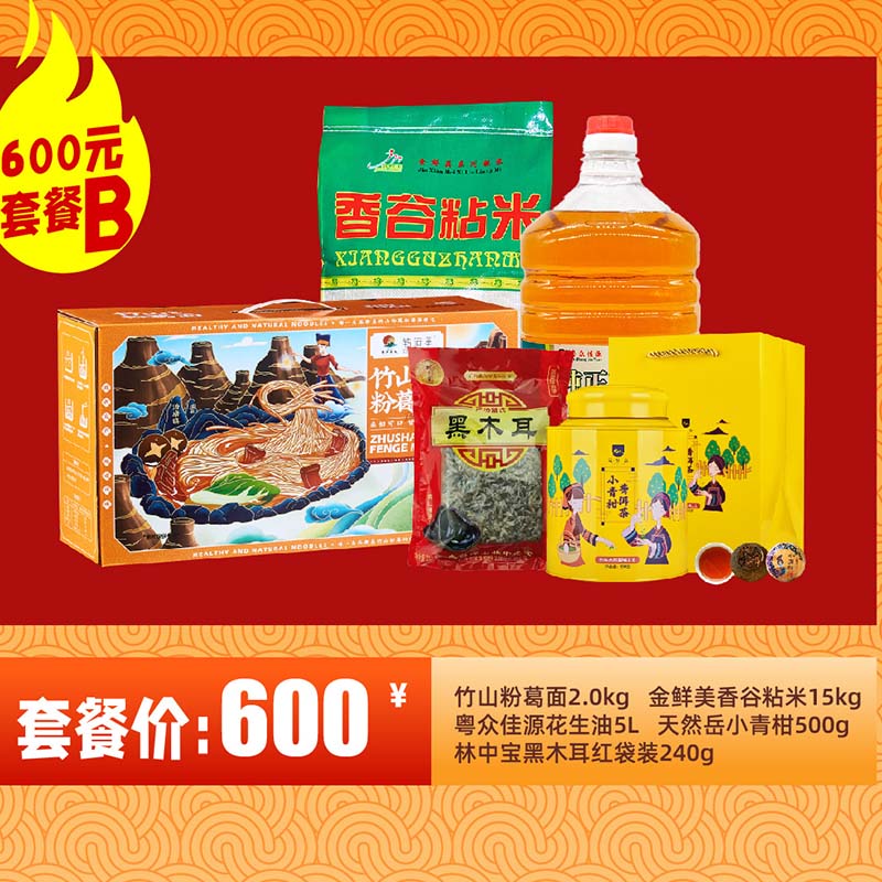 【600元套餐B】竹山粉葛面2.0kg+金鲜美香谷粘米15kg+粤众佳源花生油5L+天然岳小青柑500g+林中宝黑木耳红袋装240g