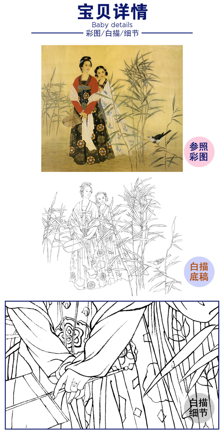 王美芳工笔传统仕女人物白描底稿《郊游图》-斗方小品册页-多种白描尺寸可选-B135