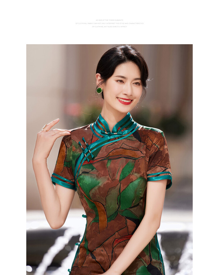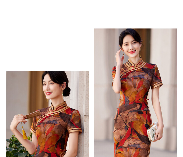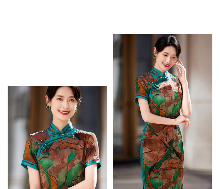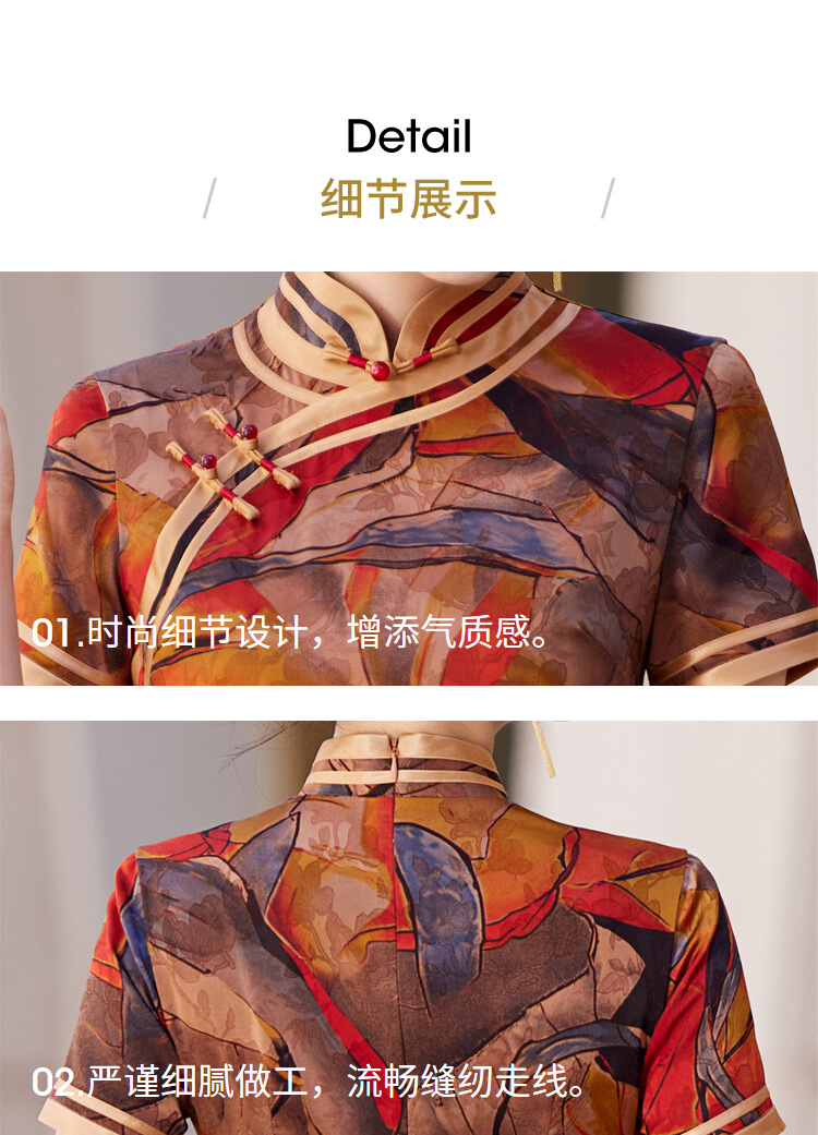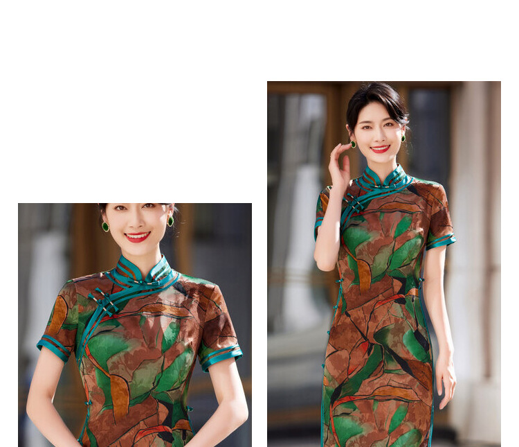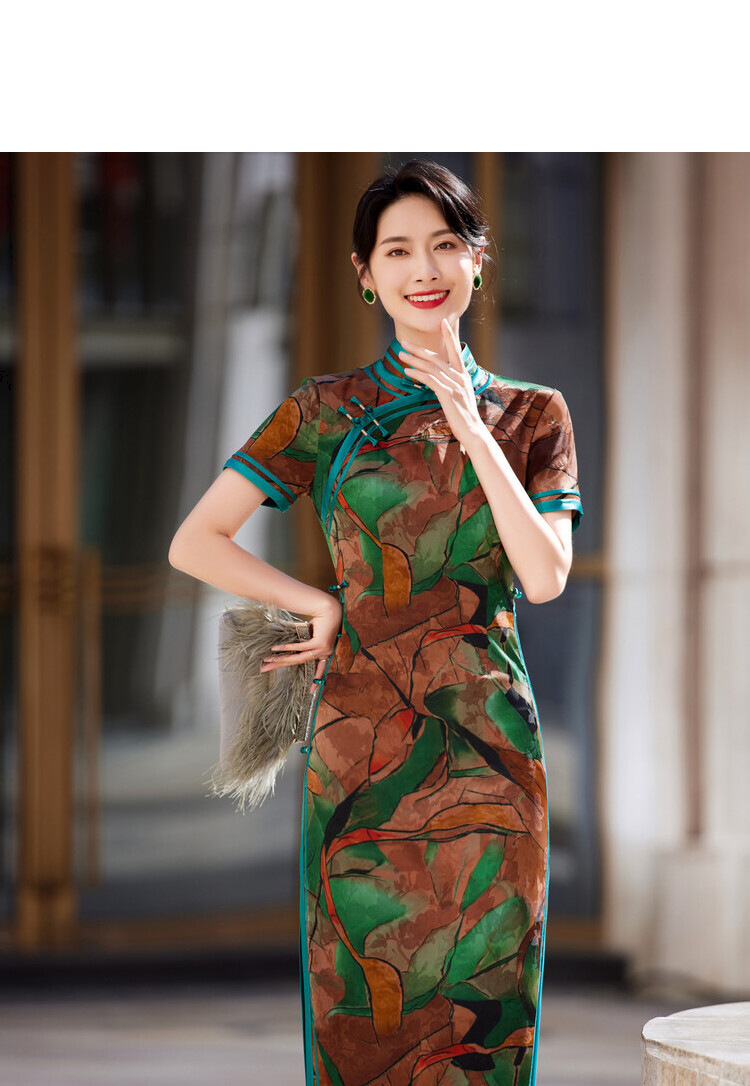 KY-83769春季新款立领短袖提花双色包边八扣印花长旗袍私服国风优雅