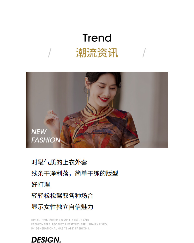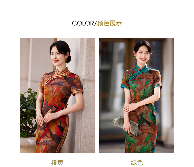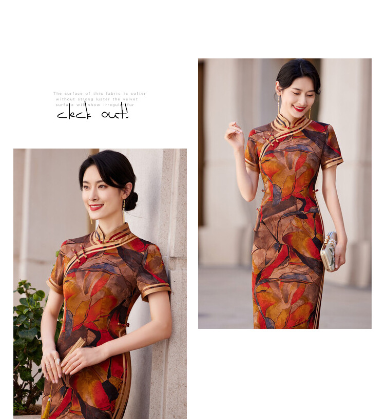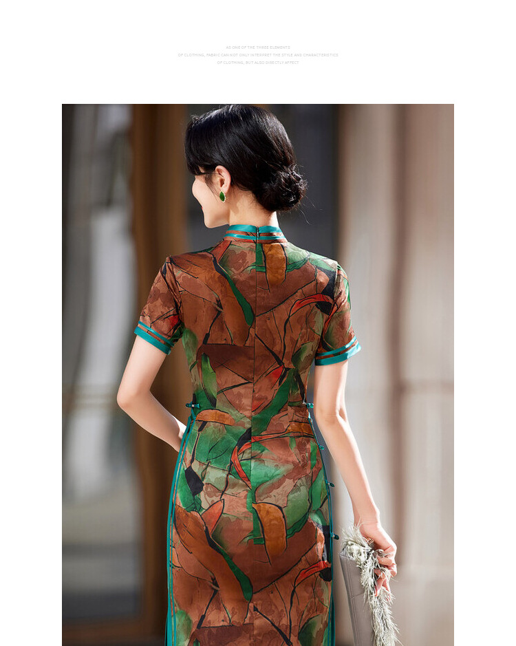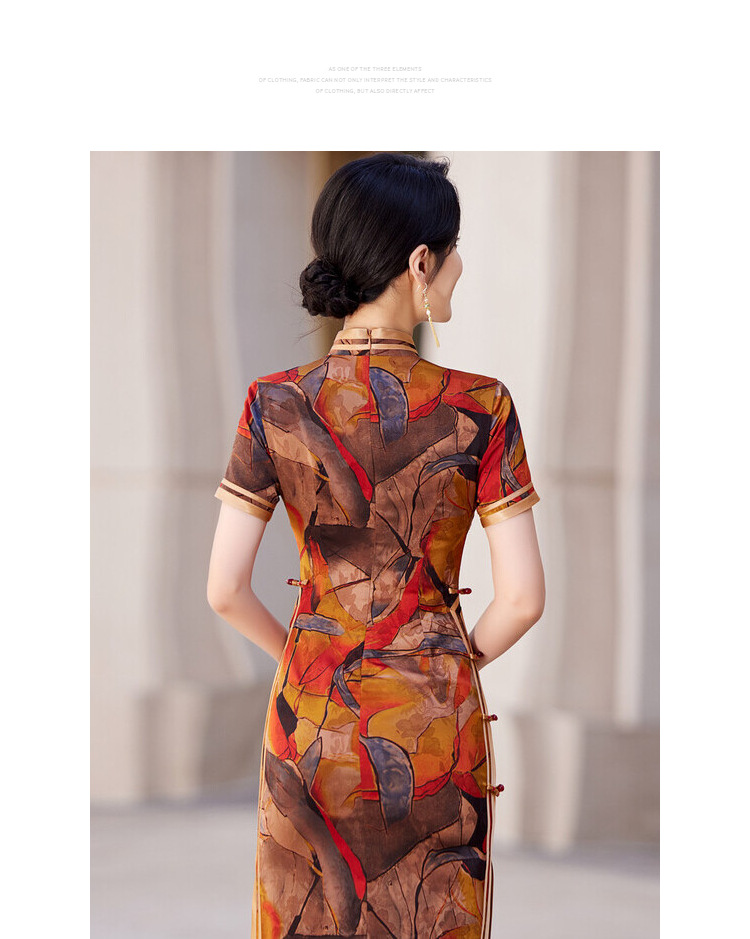 KY-83769春季新款立领短袖提花双色包边八扣印花长旗袍私服国风优雅