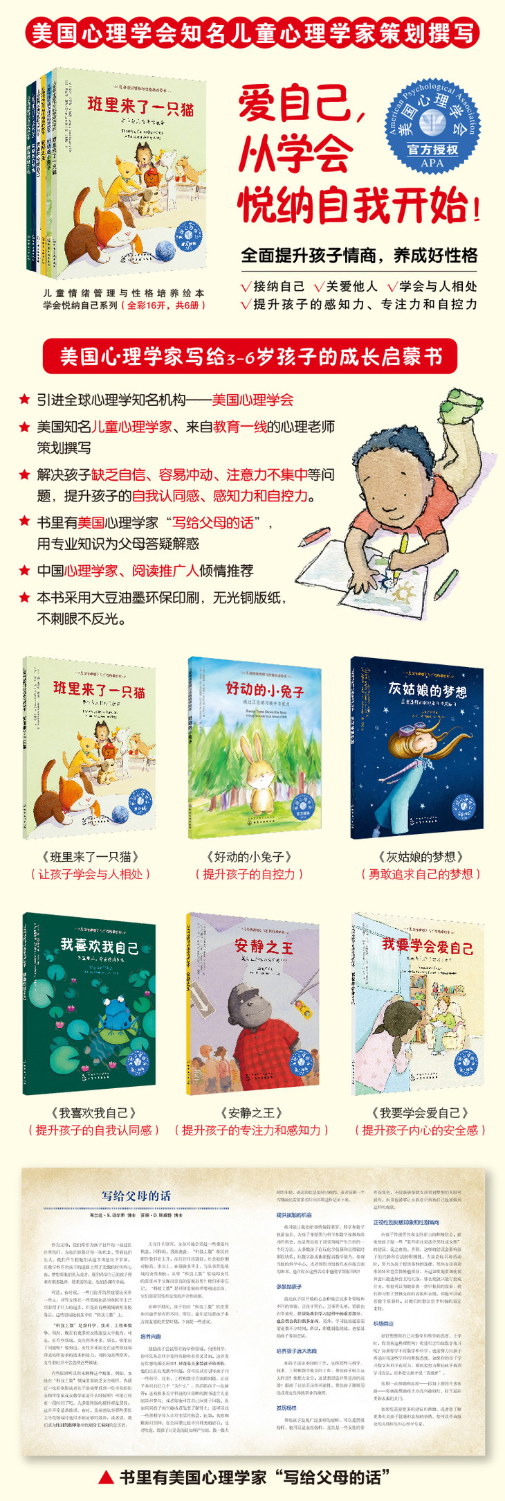 本套绘本来自美国心理学会,在内容品质、印刷品质、装帧品质上都有自己的特色: