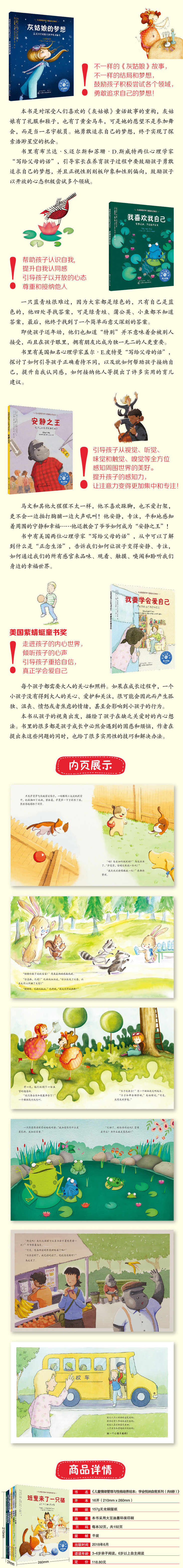 1.专业性——美国心理学会儿童心理学家撰写,专业插画家绘图,心理学背景和翻译水平兼备的妈妈们担任翻译。书后附有“写给父母和老师的话”,从儿童发展心理学的角度剖析孩子的种种表现,帮助家长理解孩子,指导孩子克服种种情绪障碍,陪伴孩子健康快乐成长。