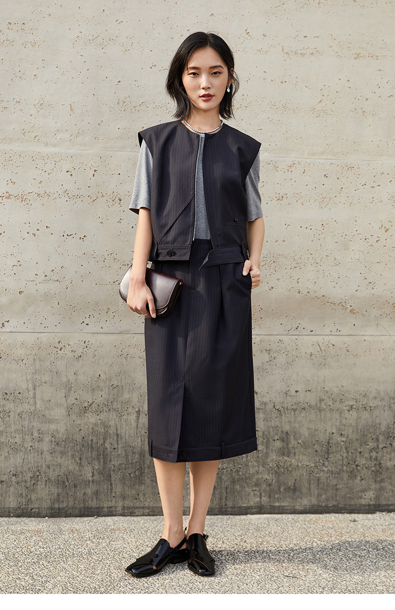 气质进阶!这款暗黑系马甲半身裙套装,诠释职场休闲新风尚