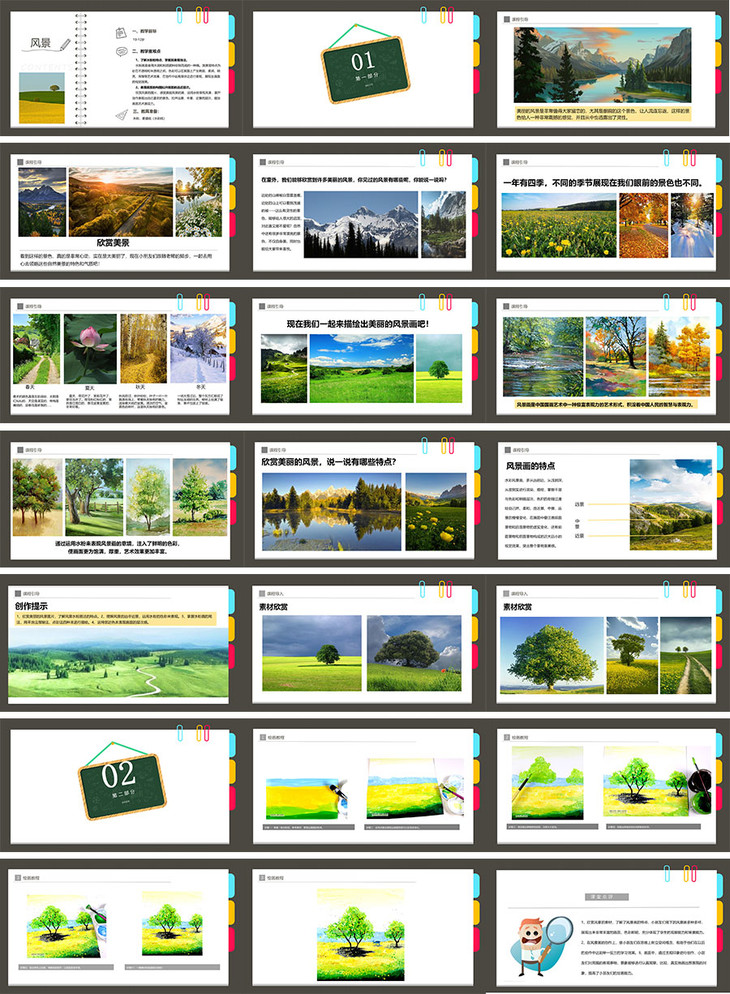 欣赏风景的图片,感受美丽风景的美,运用水粉表现风景,展开创作,表现出自己喜欢的景色,拉开远景、中景、近景的层次,增加画面艺术表现力。
