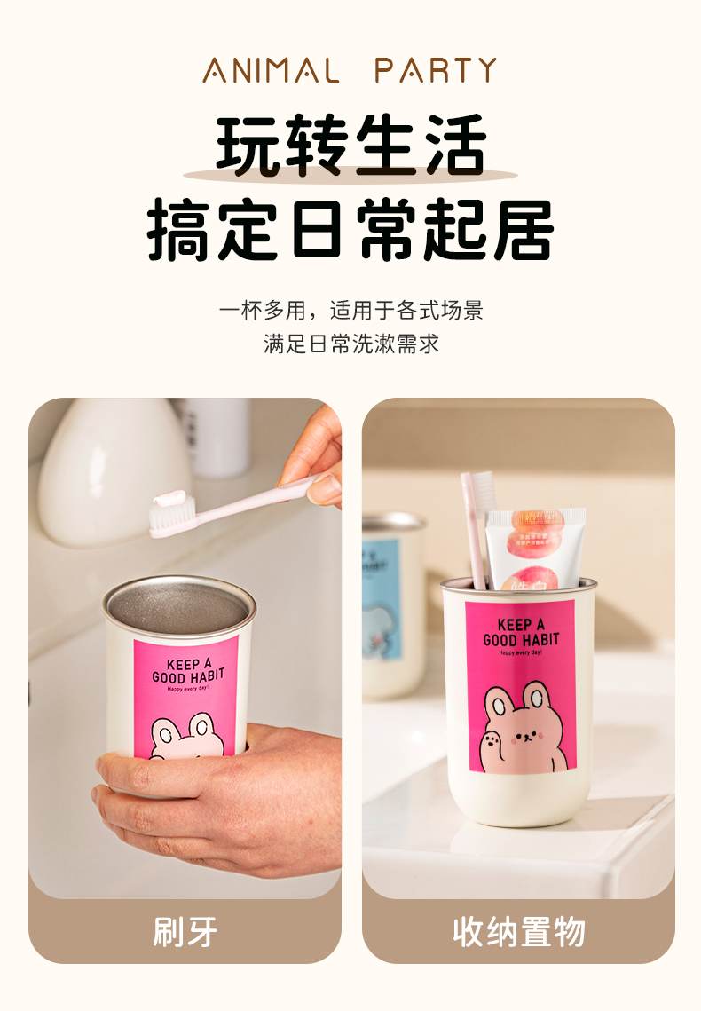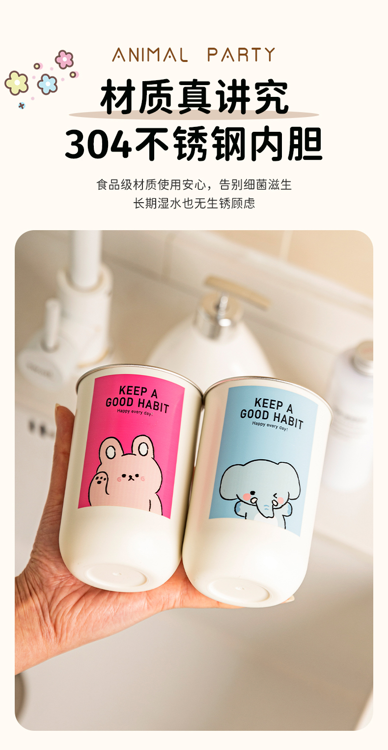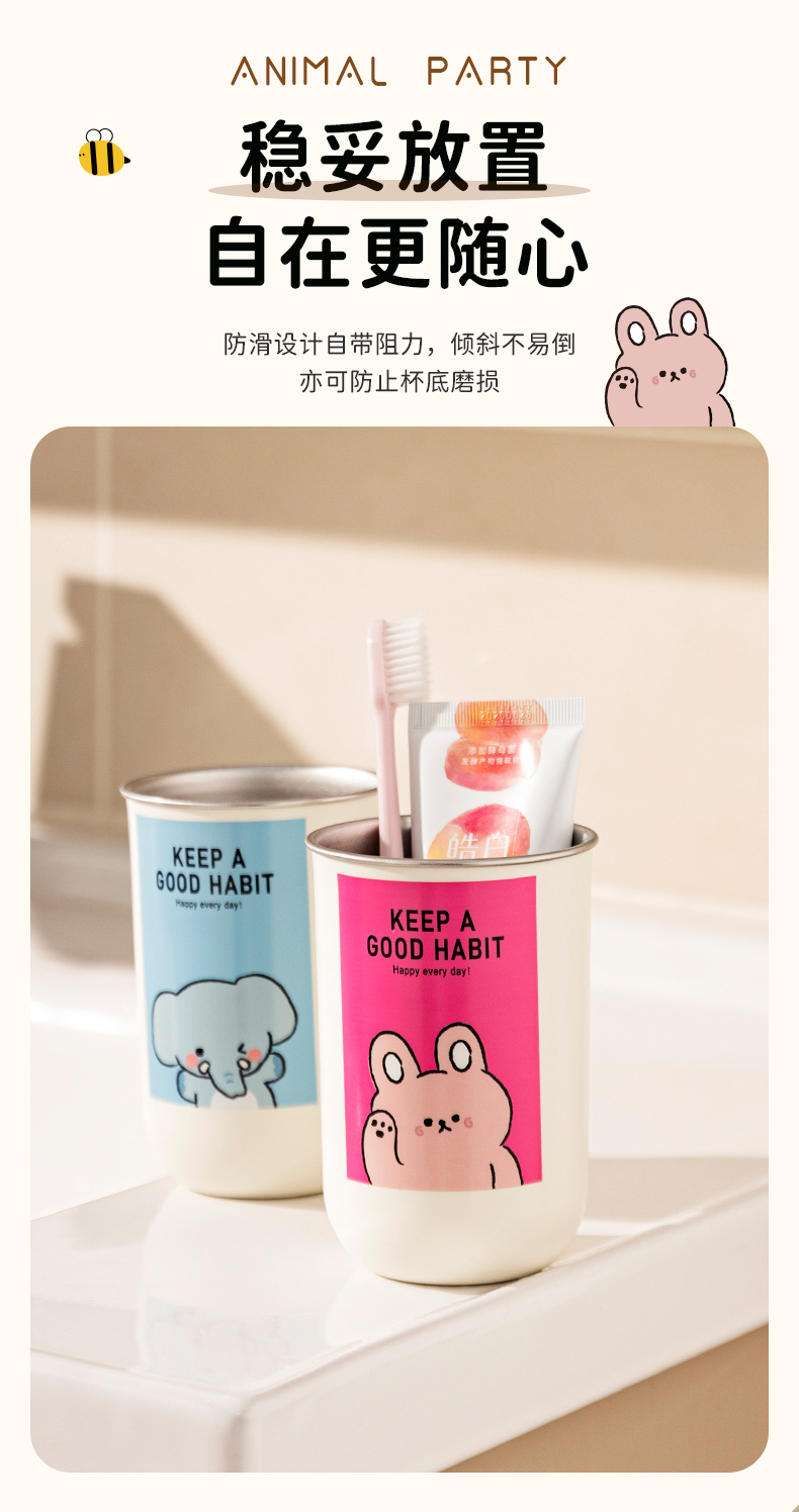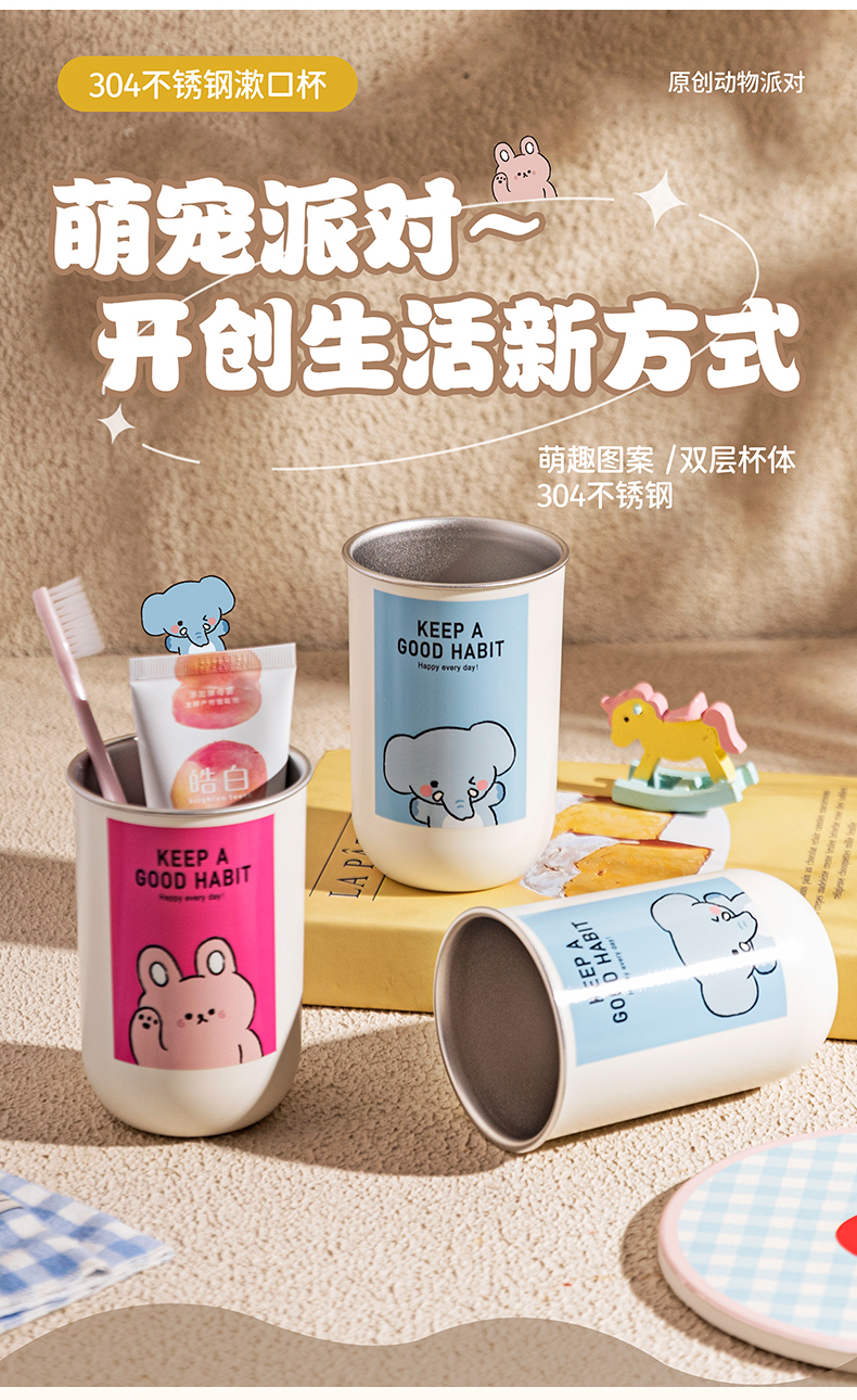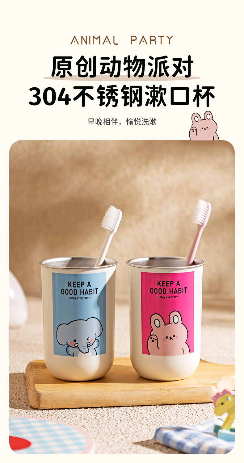 摩登主妇动物派对不锈钢漱口杯家用高档情侣刷牙杯儿童牙具洗漱杯