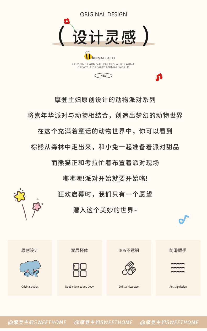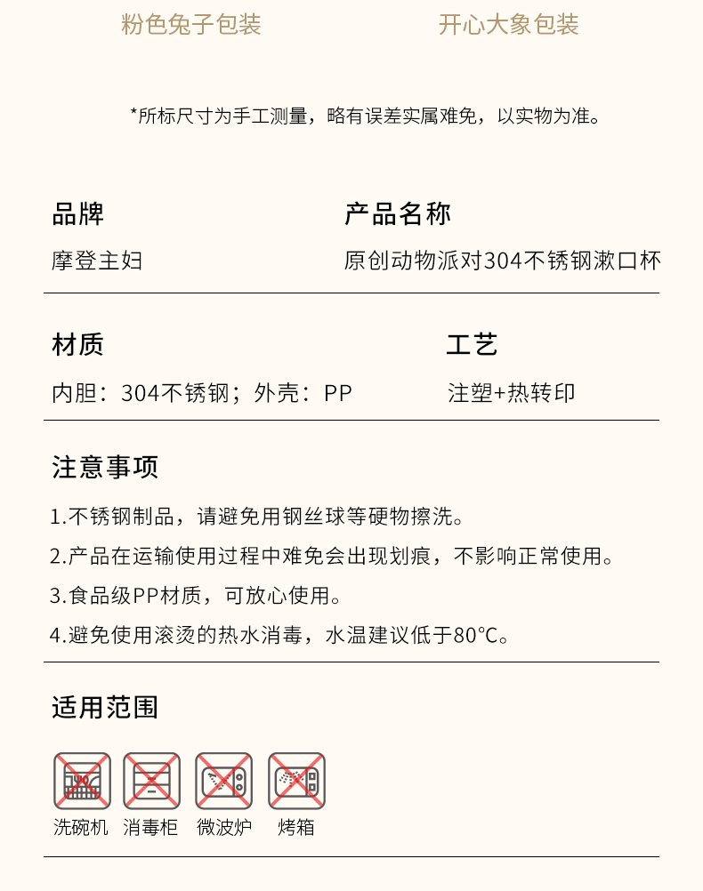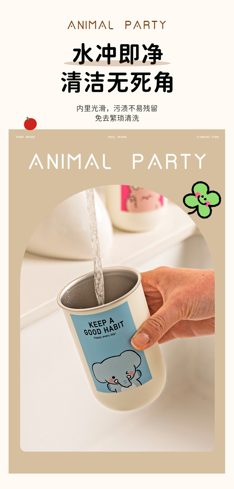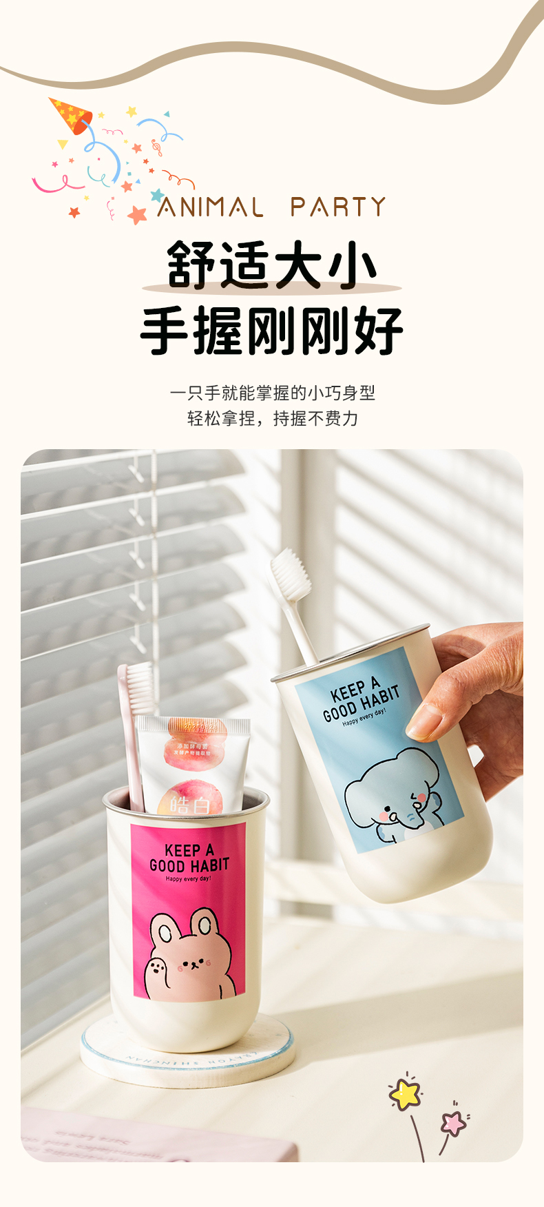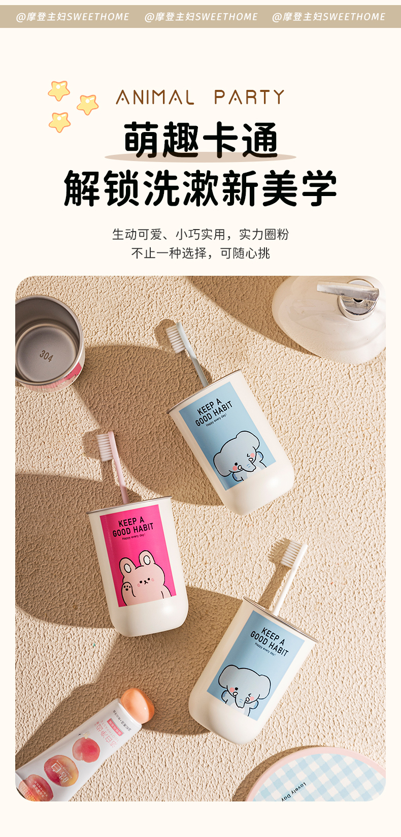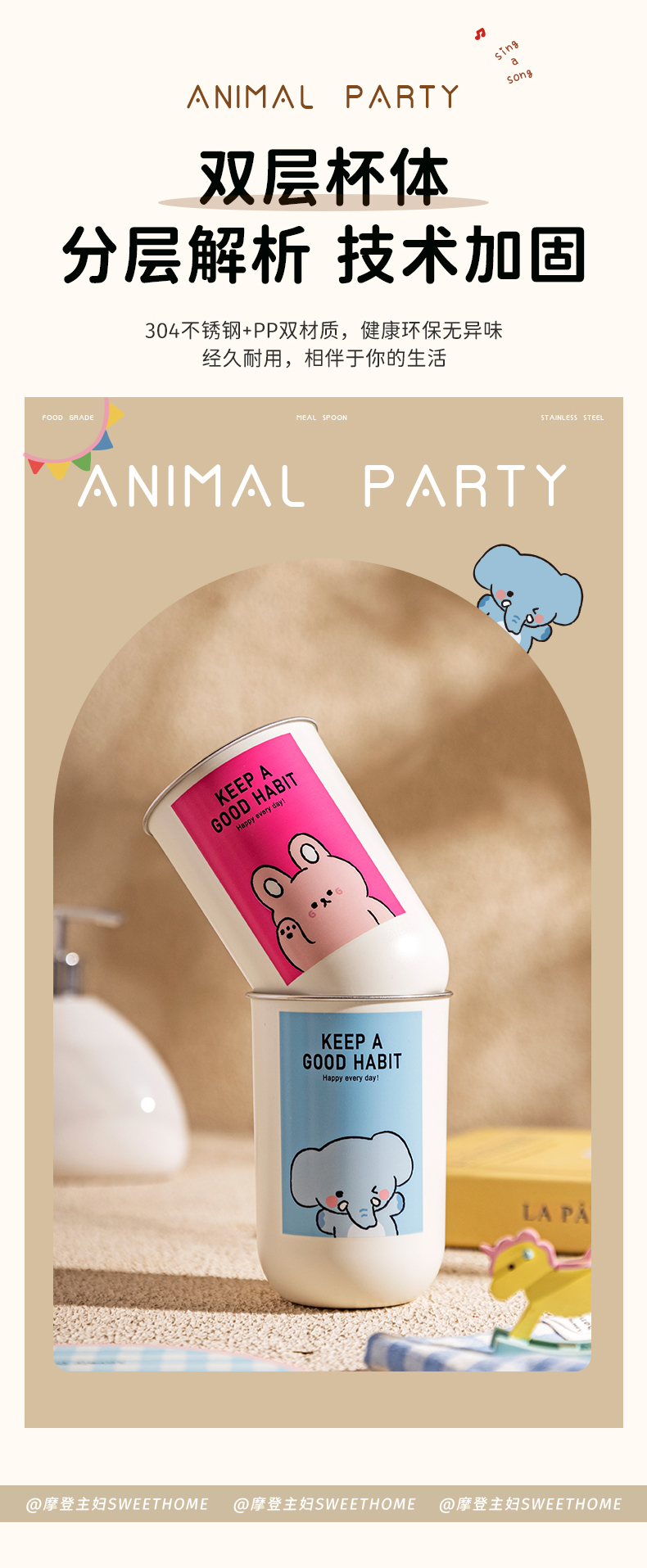 摩登主妇动物派对不锈钢漱口杯家用高档情侣刷牙杯儿童牙具洗漱杯